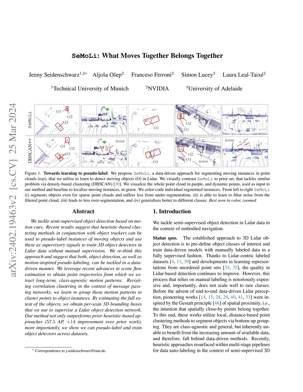 We tackle semi-supervised object detection based on motion cues. Recent results suggest that heuristic-based clustering methods in conjunction with object trackers can be used to pseudo-label instances of moving objects and use these as supervisory signals to train 3D object detectors in Lidar data without manual supervision. We re-think this approach and suggest that both, object detection, as well as motion-inspired pseudo-labeling, can be tackled in a data-driven manner. We leverage recent advances in scene flow estimation to obtain point trajectories from which we extract long-term, class-agnostic motion patterns. Revisiting correlation clustering in the context of message passing networks, we learn to group those motion patterns to cluster points to object instances. By estimating the full extent of the objects, we obtain per-scan 3D bounding boxes that we use to supervise a Lidar object detection network. Our method not only outperforms prior heuristic-based approaches (57.5 AP, +14 improvement over prior work), more importantly, we show we can pseudo-label and train object detectors across datasets.