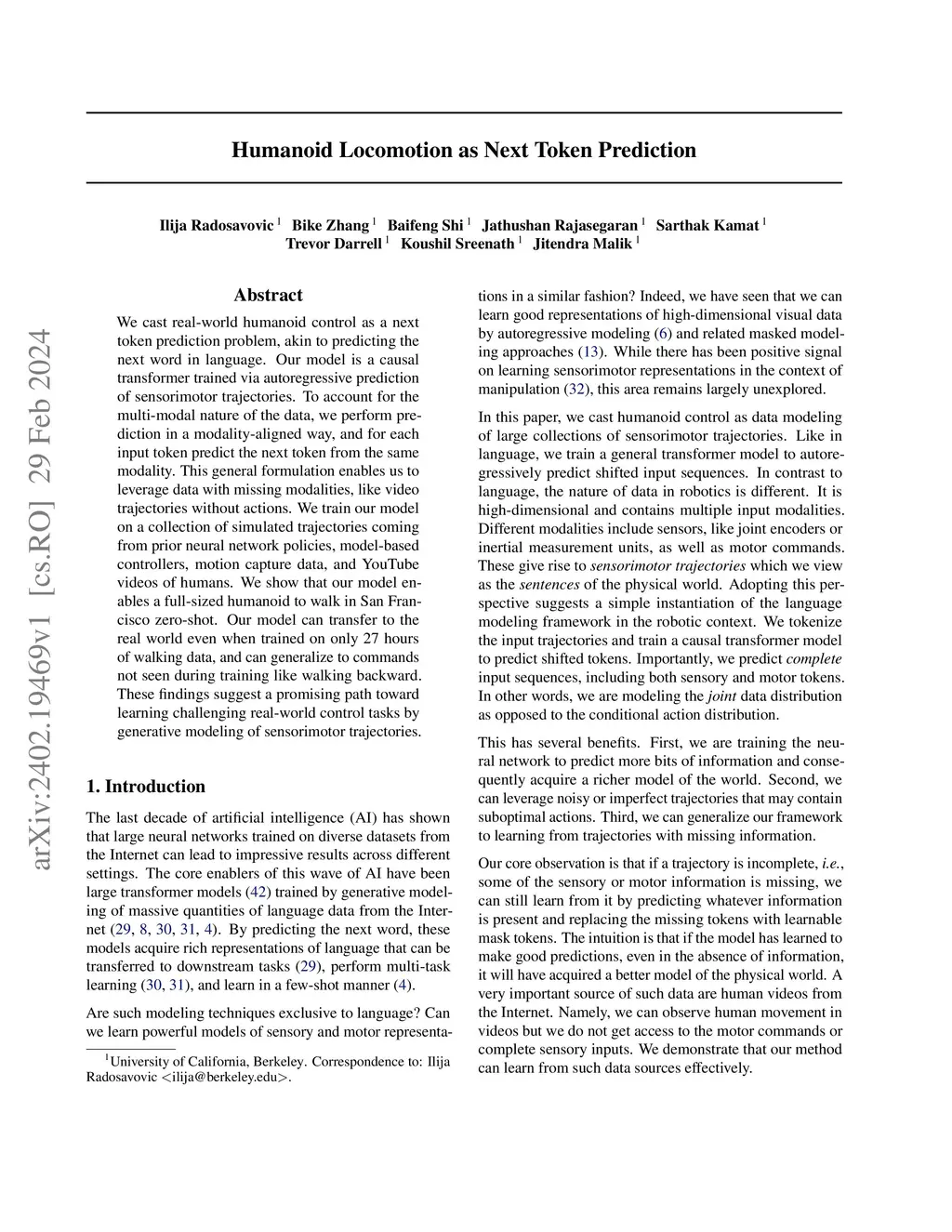 We cast real-world humanoid control as a next token prediction problem, akin to predicting the next word in language. Our model is a causal transformer trained via autoregressive prediction of sensorimotor trajectories. To account for the multi-modal nature of the data, we perform prediction in a modality-aligned way, and for each input token predict the next token from the same modality. This general formulation enables us to leverage data with missing modalities, like video trajectories without actions. We train our model on a collection of simulated trajectories coming from prior neural network policies, model-based controllers, motion capture data, and YouTube videos of humans. We show that our model enables a full-sized humanoid to walk in San Francisco zero-shot. Our model can transfer to the real world even when trained on only 27 hours of walking data, and can generalize to commands not seen during training like walking backward. These findings suggest a promising path toward learning challenging real-world control tasks by generative modeling of sensorimotor trajectories.
