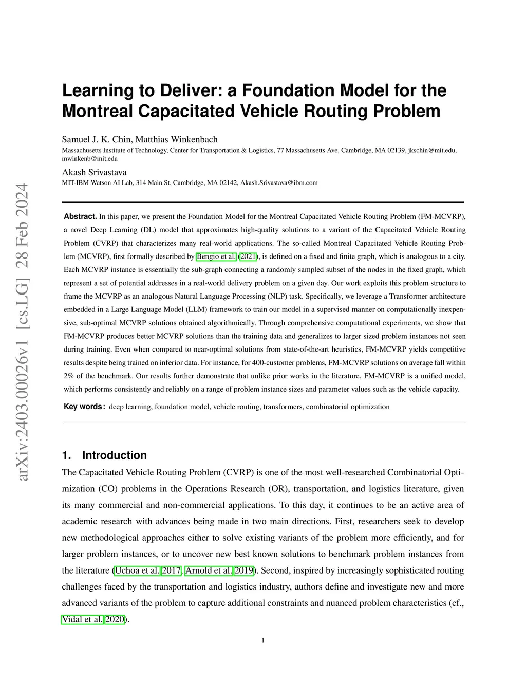 In this paper, we present the Foundation Model for the Montreal Capacitated Vehicle Routing Problem (FM-MCVRP), a novel Deep Learning (DL) model that approximates high-quality solutions to a variant of the Capacitated Vehicle Routing Problem (CVRP) that characterizes many real-world applications. The so-called Montreal Capacitated Vehicle Routing Problem (MCVRP), first formally described by Bengio et al. (2021), is defined on a fixed and finite graph, which is analogous to a city. Each MCVRP instance is essentially the sub-graph connecting a randomly sampled subset of the nodes in the fixed graph, which represent a set of potential addresses in a real-world delivery problem on a given day. Our work exploits this problem structure to frame the MCVRP as an analogous Natural Language Processing (NLP) task. Specifically, we leverage a Transformer architecture embedded in a Large Language Model (LLM) framework to train our model in a supervised manner on computationally inexpensive, sub-optimal MCVRP solutions obtained algorithmically. Through comprehensive computational experiments, we show that FM-MCVRP produces better MCVRP solutions than the training data and generalizes to larger sized problem instances not seen during training. Even when compared to near-optimal solutions from state-of-the-art heuristics, FM-MCVRP yields competitive results despite being trained on inferior data. For instance, for 400-customer problems, FM-MCVRP solutions on average fall within 2% of the benchmark. Our results further demonstrate that unlike prior works in the literature, FM-MCVRP is a unified model, which performs consistently and reliably on a range of problem instance sizes and parameter values such as the vehicle capacity.