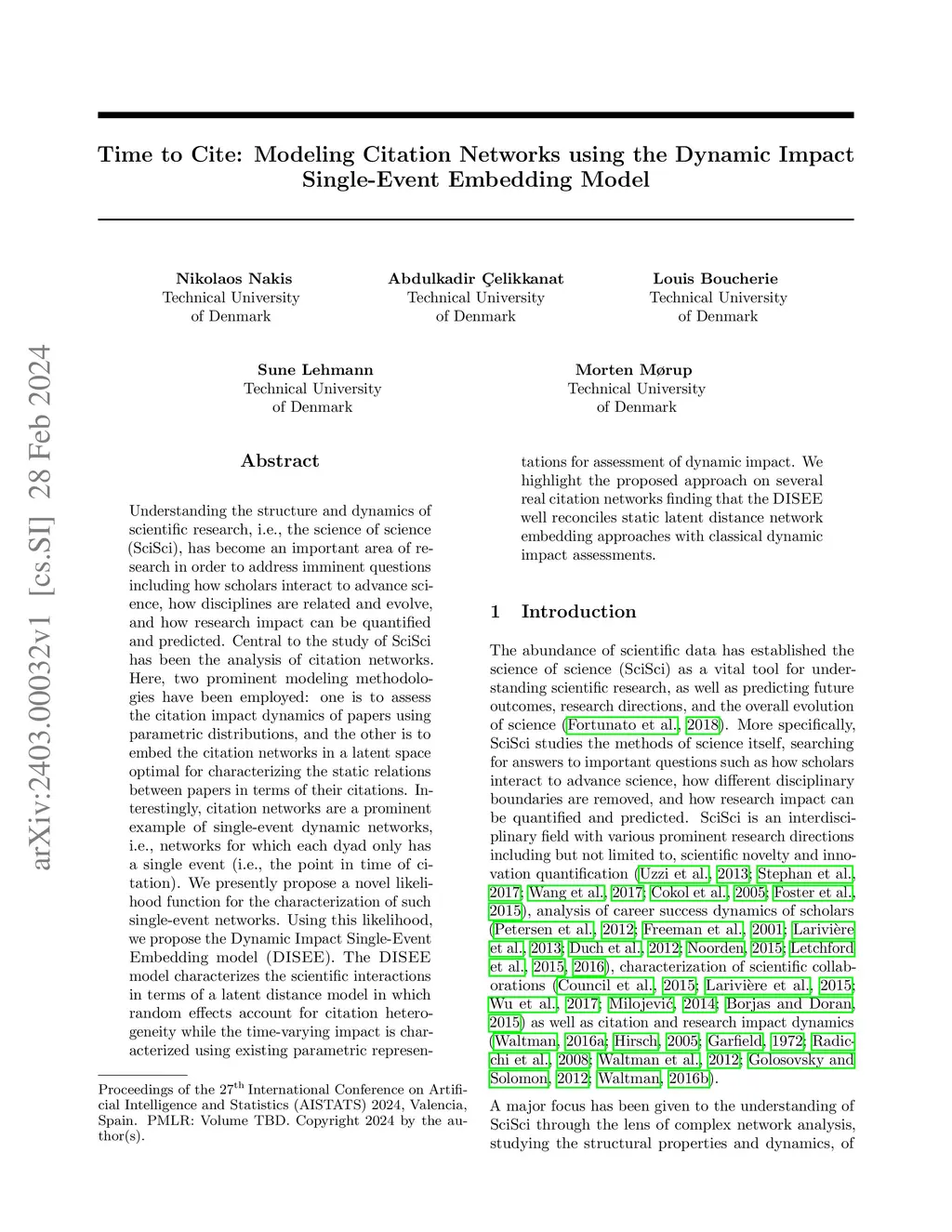Understanding the structure and dynamics of scientific research, i.e., the science of science (SciSci), has become an important area of research in order to address imminent questions including how scholars interact to advance science, how disciplines are related and evolve, and how research impact can be quantified and predicted. Central to the study of SciSci has been the analysis of citation networks. Here, two prominent modeling methodologies have been employed: one is to assess the citation impact dynamics of papers using parametric distributions, and the other is to embed the citation networks in a latent space optimal for characterizing the static relations between papers in terms of their citations. Interestingly, citation networks are a prominent example of single-event dynamic networks, i.e., networks for which each dyad only has a single event (i.e., the point in time of citation). We presently propose a novel likelihood function for the characterization of such single-event networks. Using this likelihood, we propose the Dynamic Impact Single-Event Embedding model (DISEE). The \textsc{\modelabbrev} model characterizes the scientific interactions in terms of a latent distance model in which random effects account for citation heterogeneity while the time-varying impact is characterized using existing parametric representations for assessment of dynamic impact. We highlight the proposed approach on several real citation networks finding that the DISEE well reconciles static latent distance network embedding approaches with classical dynamic impact assessments.