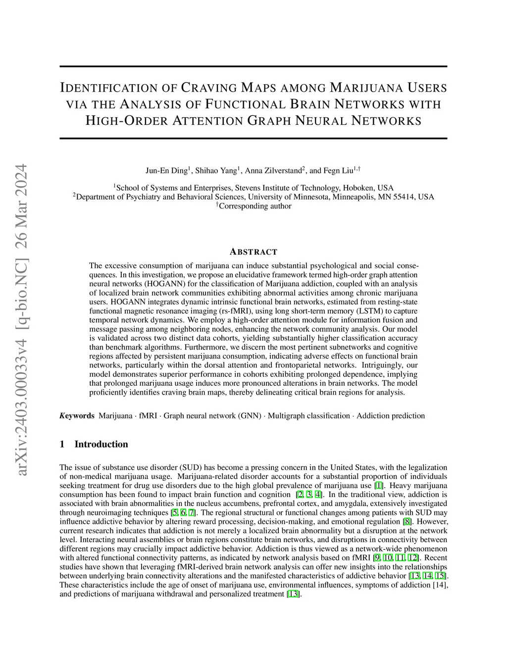 The excessive consumption of marijuana can induce substantial psychological and social consequences. In this investigation, we propose an elucidative framework termed high-order graph attention neural networks (HOGANN) for the classification of Marijuana addiction, coupled with an analysis of localized brain network communities exhibiting abnormal activities among chronic marijuana users. HOGANN integrates dynamic intrinsic functional brain networks, estimated from resting-state functional magnetic resonance imaging (rs-fMRI), using long short-term memory (LSTM) to capture temporal network dynamics. We employ a high-order attention module for information fusion and message passing among neighboring nodes, enhancing the network community analysis. Our model is validated across two distinct data cohorts, yielding substantially higher classification accuracy than benchmark algorithms. Furthermore, we discern the most pertinent subnetworks and cognitive regions affected by persistent marijuana consumption, indicating adverse effects on functional brain networks, particularly within the dorsal attention and frontoparietal networks. Intriguingly, our model demonstrates superior performance in cohorts exhibiting prolonged dependence, implying that prolonged marijuana usage induces more pronounced alterations in brain networks. The model proficiently identifies craving brain maps, thereby delineating critical brain regions for analysis.