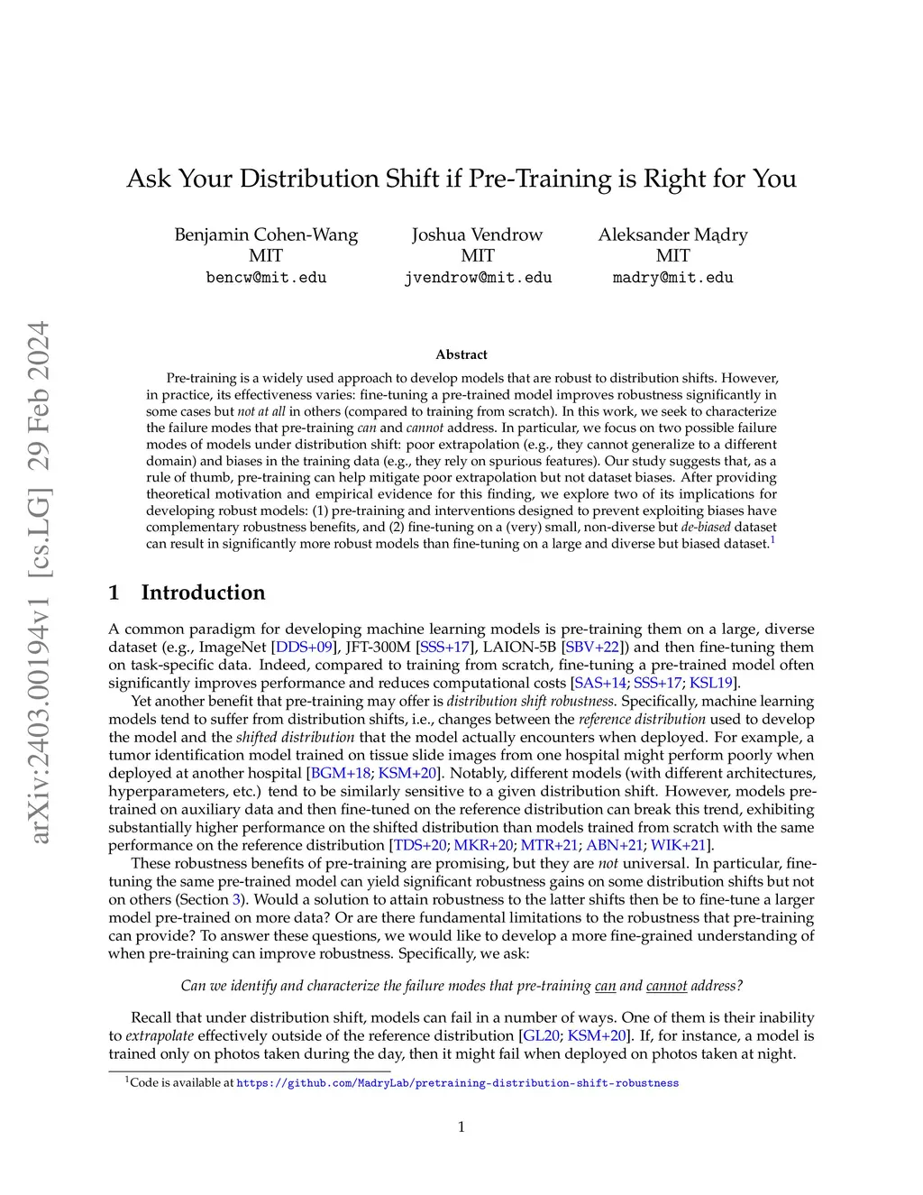 Pre-training is a widely used approach to develop models that are robust to distribution shifts. However, in practice, its effectiveness varies: fine-tuning a pre-trained model improves robustness significantly in some cases but not at all in others (compared to training from scratch). In this work, we seek to characterize the failure modes that pre-training can and cannot address. In particular, we focus on two possible failure modes of models under distribution shift: poor extrapolation (e.g., they cannot generalize to a different domain) and biases in the training data (e.g., they rely on spurious features). Our study suggests that, as a rule of thumb, pre-training can help mitigate poor extrapolation but not dataset biases. After providing theoretical motivation and empirical evidence for this finding, we explore two of its implications for developing robust models: (1) pre-training and interventions designed to prevent exploiting biases have complementary robustness benefits, and (2) fine-tuning on a (very) small, non-diverse but de-biased dataset can result in significantly more robust models than fine-tuning on a large and diverse but biased dataset. Code is available at https://github.com/MadryLab/pretraining-distribution-shift-robustness.