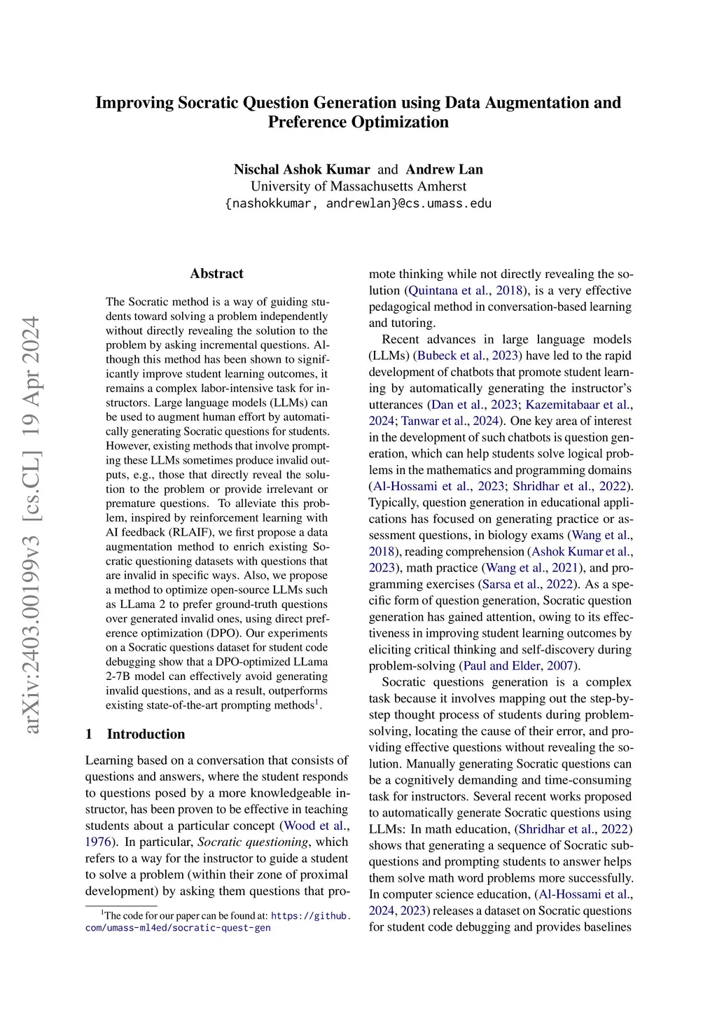 The Socratic method is a way of guiding students toward solving a problem independently without directly revealing the solution to the problem. Although this method has been shown to significantly improve student learning outcomes, it remains a complex labor-intensive task for instructors. Large language models (LLMs) can be used to augment human effort by automatically generating Socratic questions for students. However, existing methods that involve prompting these LLMs sometimes produce invalid outputs, e.g., those that directly reveal the solution to the problem or provide irrelevant or premature questions. To alleviate this problem, inspired by reinforcement learning with AI feedback (RLAIF), we first propose a data augmentation method to enrich existing Socratic questioning datasets with questions that are invalid in specific ways. Next, we propose a method to optimize open-source LLMs such as LLama 2 to prefer ground-truth questions over generated invalid ones, using direct preference optimization (DPO). Our experiments on a Socratic questions dataset for student code debugging show that a DPO-optimized 7B LLama 2 model can effectively avoid generating invalid questions, and as a result, outperforms existing state-of-the-art prompting methods.