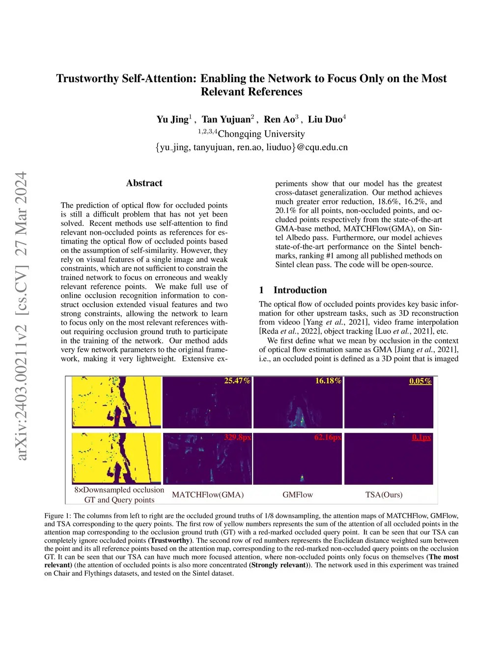 The prediction of optical flow for occluded points is still a difficult problem that has not yet been solved. Recent methods use self-attention to find relevant non-occluded points as references for estimating the optical flow of occluded points based on the assumption of self-similarity. However, they rely on visual features of a single image and weak constraints, which are not sufficient to constrain the trained network to focus on erroneous and weakly relevant reference points. We make full use of online occlusion recognition information to construct occlusion extended visual features and two strong constraints, allowing the network to learn to focus only on the most relevant references without requiring occlusion ground truth to participate in the training of the network. Our method adds very few network parameters to the original framework, making it very lightweight. Extensive experiments show that our model has the greatest cross-dataset generalization. Our method achieves much greater error reduction, 18.6%, 16.2%, and 20.1% for all points, non-occluded points, and occluded points respectively from the state-of-the-art GMA-base method, MATCHFlow(GMA), on Sintel Albedo pass. Furthermore, our model achieves state-of-the-art performance on the Sintel bench-marks, ranking \#1 among all published methods on Sintel clean pass. The code will be open-source.