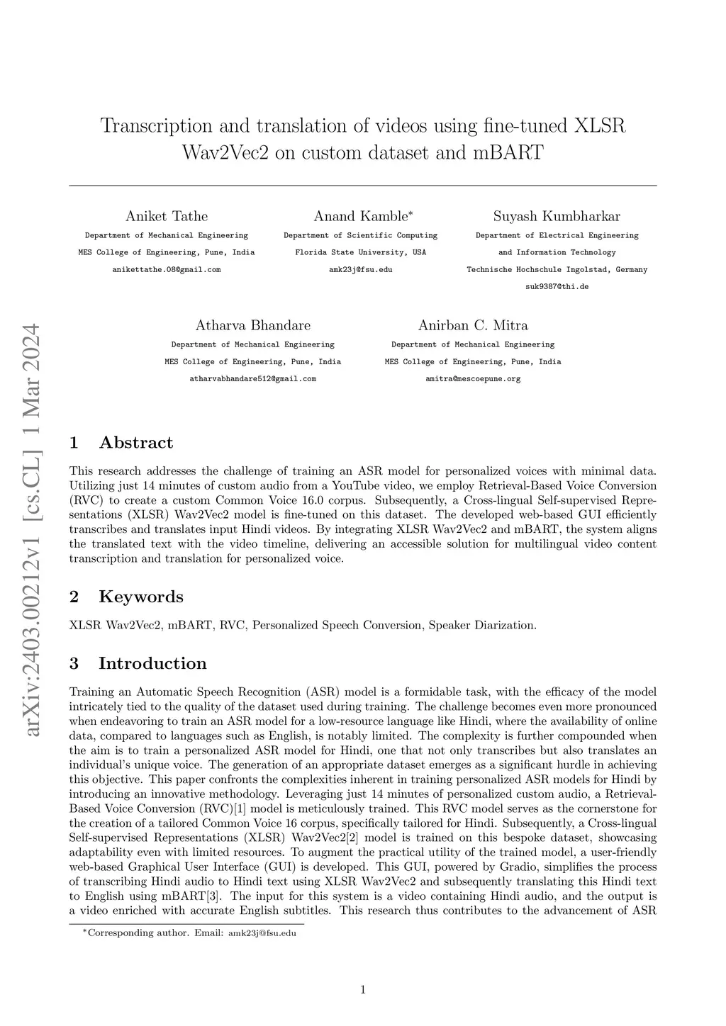 This research addresses the challenge of training an ASR model for personalized voices with minimal data. Utilizing just 14 minutes of custom audio from a YouTube video, we employ Retrieval-Based Voice Conversion (RVC) to create a custom Common Voice 16.0 corpus. Subsequently, a Cross-lingual Self-supervised Representations (XLSR) Wav2Vec2 model is fine-tuned on this dataset. The developed web-based GUI efficiently transcribes and translates input Hindi videos. By integrating XLSR Wav2Vec2 and mBART, the system aligns the translated text with the video timeline, delivering an accessible solution for multilingual video content transcription and translation for personalized voice.