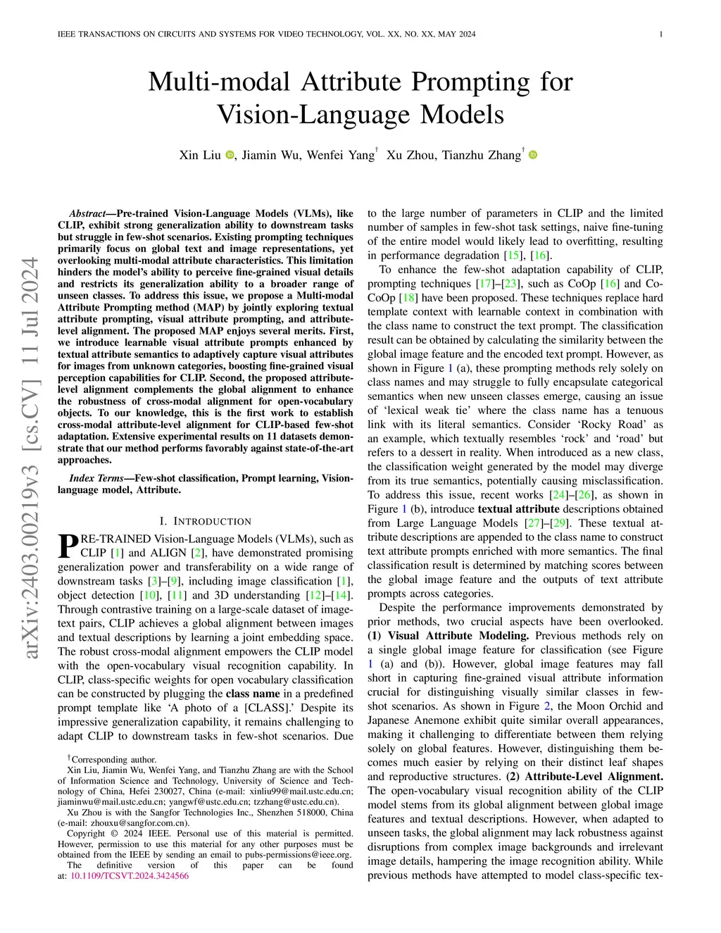 Pre-trained Vision-Language Models (VLMs), like CLIP, exhibit strong generalization ability to downstream tasks but struggle in few-shot scenarios. Existing prompting techniques primarily focus on global text and image representations, yet overlooking multi-modal attribute characteristics. This limitation hinders the model's ability to perceive fine-grained visual details and restricts its generalization ability to a broader range of unseen classes. To address this issue, we propose a Multi-modal Attribute Prompting method (MAP) by jointly exploring textual attribute prompting, visual attribute prompting, and attribute-level alignment. The proposed MAP enjoys several merits. First, we introduce learnable visual attribute prompts enhanced by textual attribute semantics to adaptively capture visual attributes for images from unknown categories, boosting fine-grained visual perception capabilities for CLIP. Second, the proposed attribute-level alignment complements the global alignment to enhance the robustness of cross-modal alignment for open-vocabulary objects. To our knowledge, this is the first work to establish cross-modal attribute-level alignment for CLIP-based few-shot adaptation. Extensive experimental results on 11 datasets demonstrate that our method performs favorably against state-of-the-art approaches.