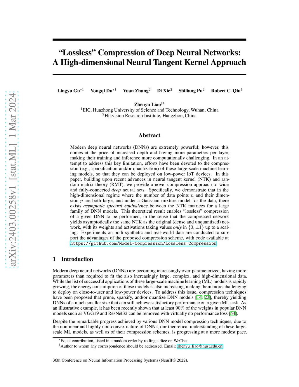 Modern deep neural networks (DNNs) are extremely powerful; however, this comes at the price of increased depth and having more parameters per layer, making their training and inference more computationally challenging. In an attempt to address this key limitation, efforts have been devoted to the compression (e.g., sparsification and/or quantization) of these large-scale machine learning models, so that they can be deployed on low-power IoT devices. In this paper, building upon recent advances in neural tangent kernel (NTK) and random matrix theory (RMT), we provide a novel compression approach to wide and fully-connected \emph{deep} neural nets. Specifically, we demonstrate that in the high-dimensional regime where the number of data points and their dimension are both large, and under a Gaussian mixture model for the data, there exists \emph{asymptotic spectral equivalence} between the NTK matrices for a large family of DNN models. This theoretical result enables "lossless" compression of a given DNN to be performed, in the sense that the compressed network yields asymptotically the same NTK as the original (dense and unquantized) network, with its weights and activations taking values \emph{only} in up to a scaling. Experiments on both synthetic and real-world data are conducted to support the advantages of the proposed compression scheme, with code available at \url{https://github.com/Model-Compression/Lossless_Compression}.