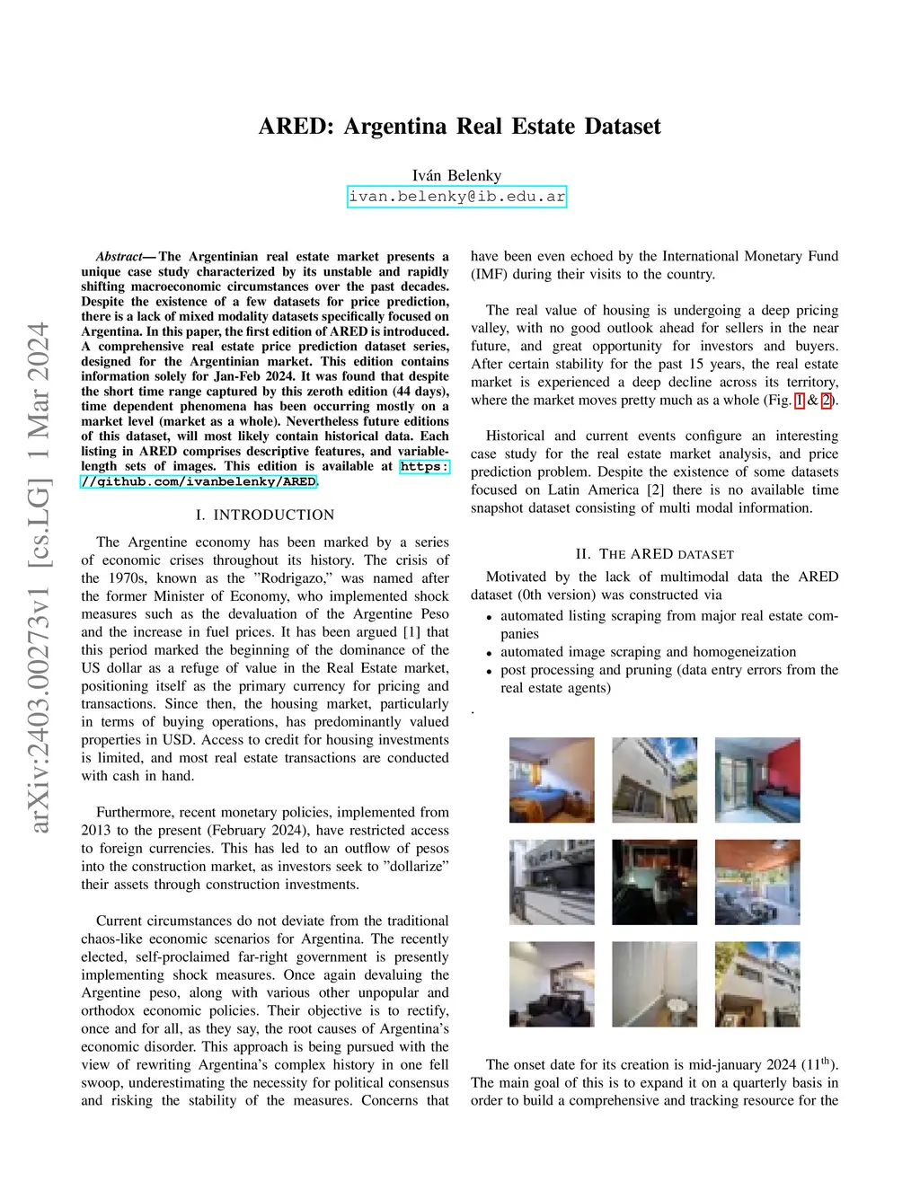 The Argentinian real estate market presents a unique case study characterized by its unstable and rapidly shifting macroeconomic circumstances over the past decades. Despite the existence of a few datasets for price prediction, there is a lack of mixed modality datasets specifically focused on Argentina. In this paper, the first edition of ARED is introduced. A comprehensive real estate price prediction dataset series, designed for the Argentinian market. This edition contains information solely for Jan-Feb 2024. It was found that despite the short time range captured by this zeroth edition (44 days), time dependent phenomena has been occurring mostly on a market level (market as a whole). Nevertheless future editions of this dataset, will most likely contain historical data. Each listing in ARED comprises descriptive features, and variable-length sets of images.
