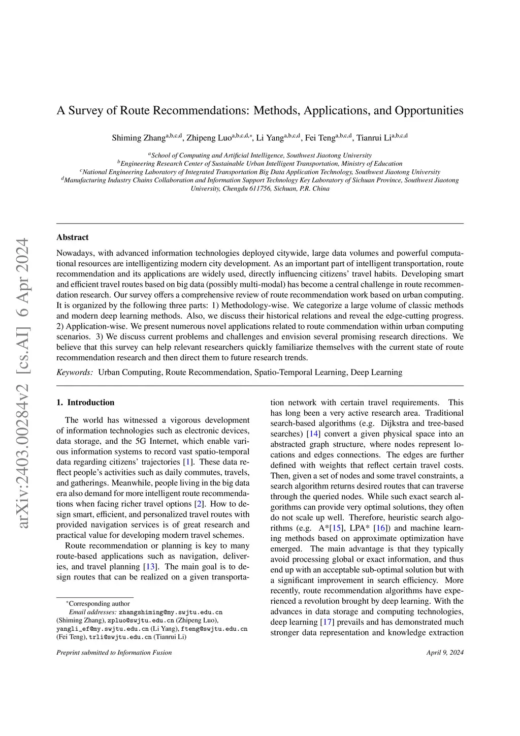 Nowadays, with advanced information technologies deployed citywide, large data volumes and powerful computational resources are intelligentizing modern city development. As an important part of intelligent transportation, route recommendation and its applications are widely used, directly influencing citizens` travel habits. Developing smart and efficient travel routes based on big data (possibly multi-modal) has become a central challenge in route recommendation research. Our survey offers a comprehensive review of route recommendation work based on urban computing. It is organized by the following three parts: 1) Methodology-wise. We categorize a large volume of traditional machine learning and modern deep learning methods. Also, we discuss their historical relations and reveal the edge-cutting progress. 2) Application\-wise. We present numerous novel applications related to route commendation within urban computing scenarios. 3) We discuss current problems and challenges and envision several promising research directions. We believe that this survey can help relevant researchers quickly familiarize themselves with the current state of route recommendation research and then direct them to future research trends.