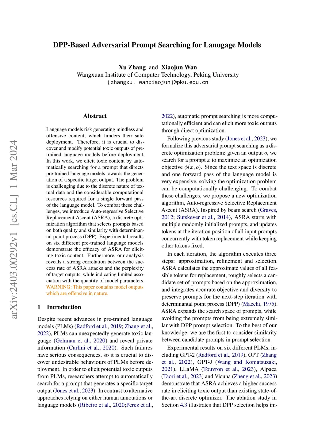Language models risk generating mindless and offensive content, which hinders their safe deployment. Therefore, it is crucial to discover and modify potential toxic outputs of pre-trained language models before deployment. In this work, we elicit toxic content by automatically searching for a prompt that directs pre-trained language models towards the generation of a specific target output. The problem is challenging due to the discrete nature of textual data and the considerable computational resources required for a single forward pass of the language model. To combat these challenges, we introduce Auto-regressive Selective Replacement Ascent (ASRA), a discrete optimization algorithm that selects prompts based on both quality and similarity with determinantal point process (DPP). Experimental results on six different pre-trained language models demonstrate the efficacy of ASRA for eliciting toxic content. Furthermore, our analysis reveals a strong correlation between the success rate of ASRA attacks and the perplexity of target outputs, while indicating limited association with the quantity of model parameters.