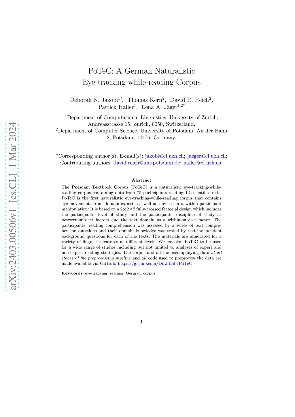 PoTeC: A German Naturalistic Eye-tracking-while-reading Corpus