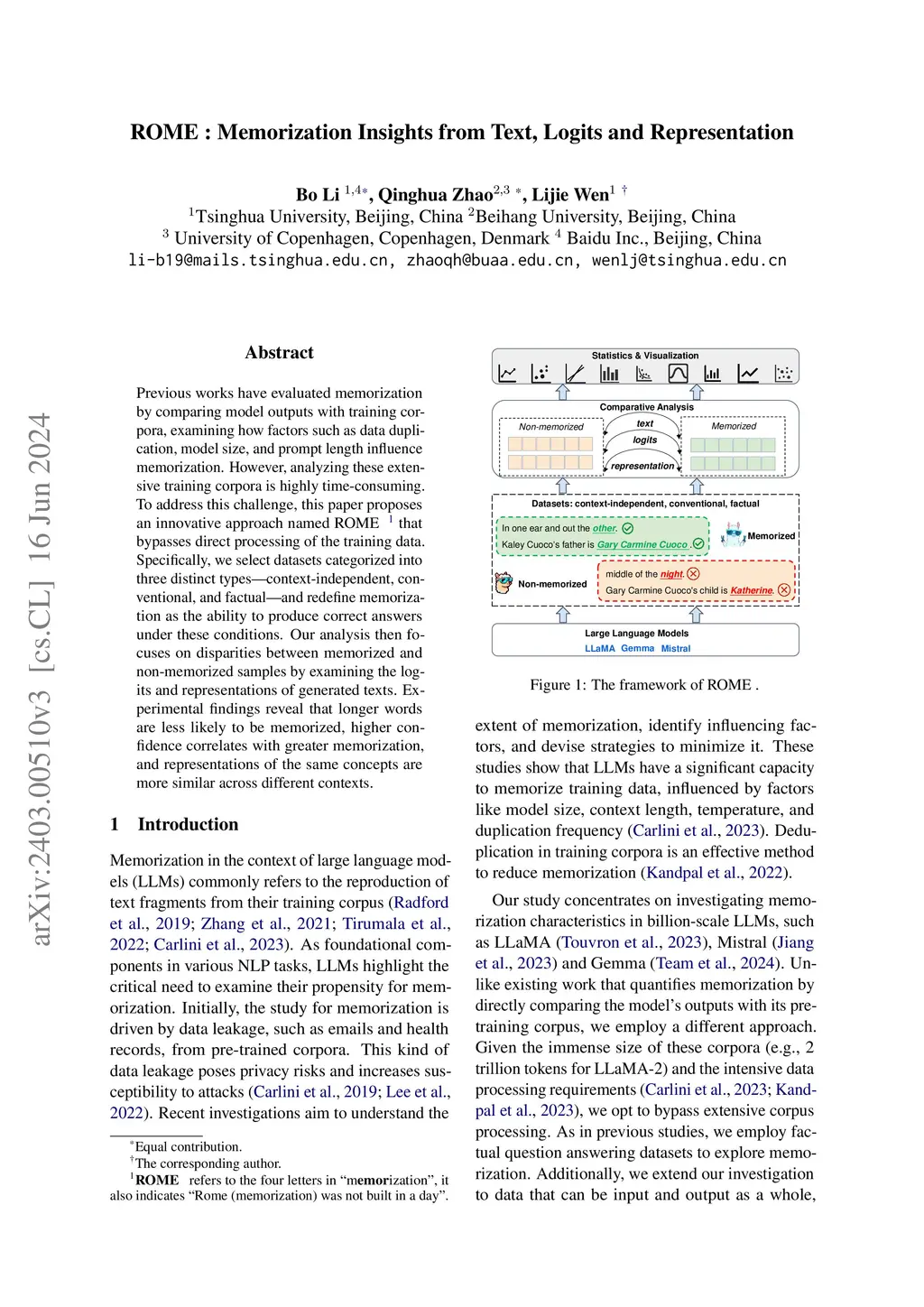 Previous works have evaluated memorization by comparing model outputs with training corpora, examining how factors such as data duplication, model size, and prompt length influence memorization. However, analyzing these extensive training corpora is highly time-consuming. To address this challenge, this paper proposes an innovative approach named ROME that bypasses direct processing of the training data. Specifically, we select datasets categorized into three distinct types -- context-independent, conventional, and factual -- and redefine memorization as the ability to produce correct answers under these conditions. Our analysis then focuses on disparities between memorized and non-memorized samples by examining the logits and representations of generated texts. Experimental findings reveal that longer words are less likely to be memorized, higher confidence correlates with greater memorization, and representations of the same concepts are more similar across different contexts. Our code and data will be publicly available when the paper is accepted.
