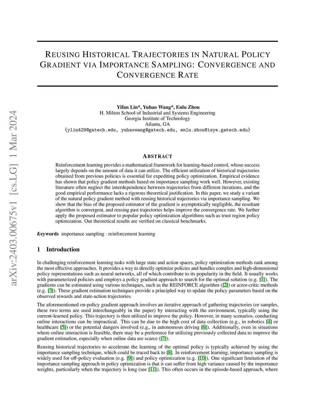 Reinforcement learning provides a mathematical framework for learning-based control, whose success largely depends on the amount of data it can utilize. The efficient utilization of historical trajectories obtained from previous policies is essential for expediting policy optimization. Empirical evidence has shown that policy gradient methods based on importance sampling work well. However, existing literature often neglect the interdependence between trajectories from different iterations, and the good empirical performance lacks a rigorous theoretical justification. In this paper, we study a variant of the natural policy gradient method with reusing historical trajectories via importance sampling. We show that the bias of the proposed estimator of the gradient is asymptotically negligible, the resultant algorithm is convergent, and reusing past trajectories helps improve the convergence rate. We further apply the proposed estimator to popular policy optimization algorithms such as trust region policy optimization. Our theoretical results are verified on classical benchmarks.