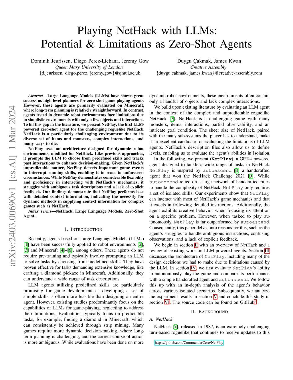 Large Language Models (LLMs) have shown great success as high-level planners for zero-shot game-playing agents. However, these agents are primarily evaluated on Minecraft, where long-term planning is relatively straightforward. In contrast, agents tested in dynamic robot environments face limitations due to simplistic environments with only a few objects and interactions. To fill this gap in the literature, we present NetPlay, the first LLM-powered zero-shot agent for the challenging roguelike NetHack. NetHack is a particularly challenging environment due to its diverse set of items and monsters, complex interactions, and many ways to die. NetPlay uses an architecture designed for dynamic robot environments, modified for NetHack. Like previous approaches, it prompts the LLM to choose from predefined skills and tracks past interactions to enhance decision-making. Given NetHack's unpredictable nature, NetPlay detects important game events to interrupt running skills, enabling it to react to unforeseen circumstances. While NetPlay demonstrates considerable flexibility and proficiency in interacting with NetHack's mechanics, it struggles with ambiguous task descriptions and a lack of explicit feedback. Our findings demonstrate that NetPlay performs best with detailed context information, indicating the necessity for dynamic methods in supplying context information for complex games such as NetHack.