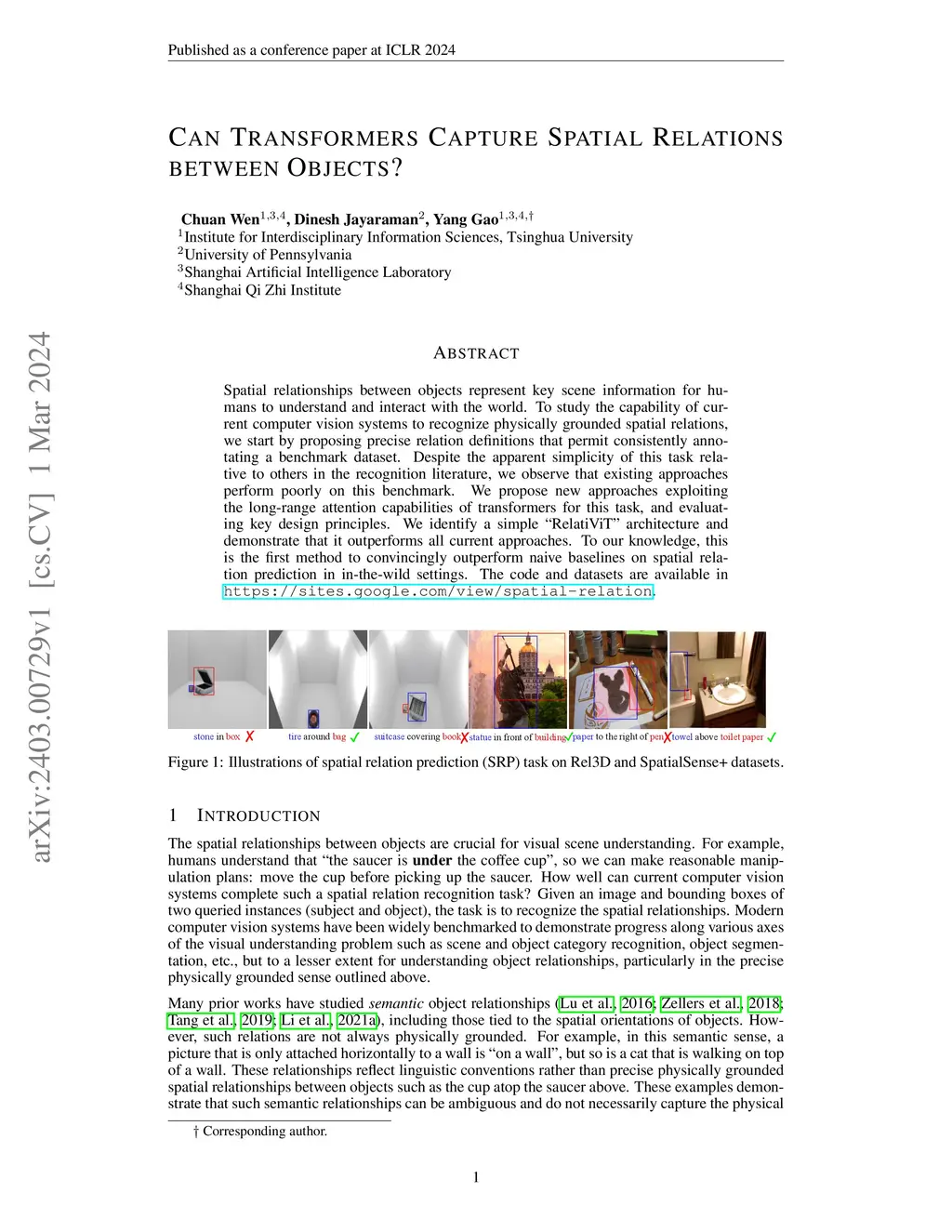 Spatial relationships between objects represent key scene information for humans to understand and interact with the world. To study the capability of current computer vision systems to recognize physically grounded spatial relations, we start by proposing precise relation definitions that permit consistently annotating a benchmark dataset. Despite the apparent simplicity of this task relative to others in the recognition literature, we observe that existing approaches perform poorly on this benchmark. We propose new approaches exploiting the long-range attention capabilities of transformers for this task, and evaluating key design principles. We identify a simple "RelatiViT" architecture and demonstrate that it outperforms all current approaches. To our knowledge, this is the first method to convincingly outperform naive baselines on spatial relation prediction in in-the-wild settings. The code and datasets are available in \url{https://sites.google.com/view/spatial-relation}.