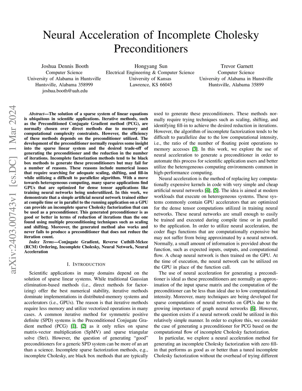 The solution of a sparse system of linear equations is ubiquitous in scientific applications. Iterative methods, such as the Preconditioned Conjugate Gradient method (PCG), are normally chosen over direct methods due to memory and computational complexity constraints. However, the efficiency of these methods depends on the preconditioner utilized. The development of the preconditioner normally requires some insight into the sparse linear system and the desired trade-off of generating the preconditioner and the reduction in the number of iterations. Incomplete factorization methods tend to be black box methods to generate these preconditioners but may fail for a number of reasons. These reasons include numerical issues that require searching for adequate scaling, shifting, and fill-in while utilizing a difficult to parallelize algorithm. With a move towards heterogeneous computing, many sparse applications find GPUs that are optimized for dense tensor applications like training neural networks being underutilized. In this work, we demonstrate that a simple artificial neural network trained either at compile time or in parallel to the running application on a GPU can provide an incomplete sparse Cholesky factorization that can be used as a preconditioner. This generated preconditioner is as good or better in terms of reduction of iterations than the one found using multiple preconditioning techniques such as scaling and shifting. Moreover, the generated method also works and never fails to produce a preconditioner that does not reduce the iteration count.