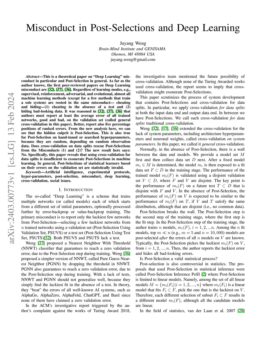 This is a theoretical paper on "Deep Learning" misconduct in particular and Post-Selection in general. As far as the author knows, the first peer-reviewed papers on Deep Learning misconduct are [32], [37], [36]. Regardless of learning modes, e.g., supervised, reinforcement, adversarial, and evolutional, almost all machine learning methods (except for a few methods that train a sole system) are rooted in the same misconduct -- cheating and hiding -- (1) cheating in the absence of a test and (2) hiding bad-looking data. It was reasoned in [32], [37], [36] that authors must report at least the average error of all trained networks, good and bad, on the validation set (called general cross-validation in this paper). Better, report also five percentage positions of ranked errors. From the new analysis here, we can see that the hidden culprit is Post-Selection. This is also true for Post-Selection on hand-tuned or searched hyperparameters, because they are random, depending on random observation data. Does cross-validation on data splits rescue Post-Selections from the Misconducts (1) and (2)? The new result here says: No. Specifically, this paper reveals that using cross-validation for data splits is insufficient to exonerate Post-Selections in machine learning. In general, Post-Selections of statistical learners based on their errors on the validation set are statistically invalid.