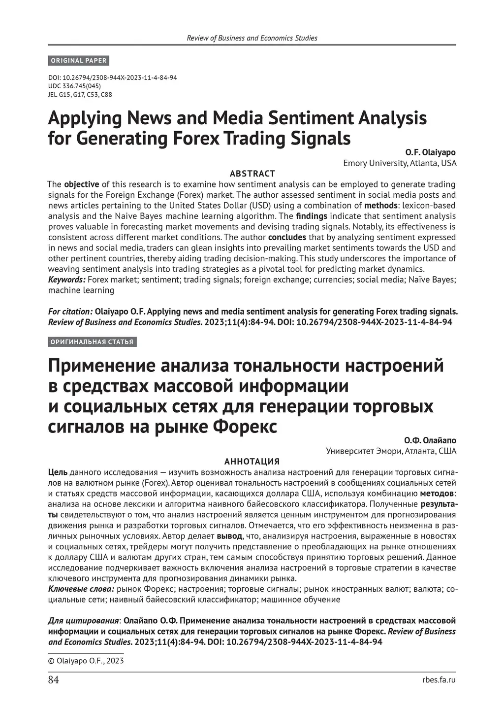 The objective of this research is to examine how sentiment analysis can be employed to generate trading signals for the Foreign Exchange (Forex) market. The author assessed sentiment in social media posts and news articles pertaining to the United States Dollar (USD) using a combination of methods: lexicon-based analysis and the Naive Bayes machine learning algorithm. The findings indicate that sentiment analysis proves valuable in forecasting market movements and devising trading signals. Notably, its effectiveness is consistent across different market conditions. The author concludes that by analyzing sentiment expressed in news and social media, traders can glean insights into prevailing market sentiments towards the USD and other pertinent countries, thereby aiding trading decision-making. This study underscores the importance of weaving sentiment analysis into trading strategies as a pivotal tool for predicting market dynamics.