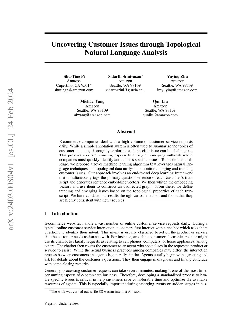 E-commerce companies deal with a high volume of customer service requests daily. While a simple annotation system is often used to summarize the topics of customer contacts, thoroughly exploring each specific issue can be challenging. This presents a critical concern, especially during an emerging outbreak where companies must quickly identify and address specific issues. To tackle this challenge, we propose a novel machine learning algorithm that leverages natural language techniques and topological data analysis to monitor emerging and trending customer issues. Our approach involves an end-to-end deep learning framework that simultaneously tags the primary question sentence of each customer's transcript and generates sentence embedding vectors. We then whiten the embedding vectors and use them to construct an undirected graph. From there, we define trending and emerging issues based on the topological properties of each transcript. We have validated our results through various methods and found that they are highly consistent with news sources.