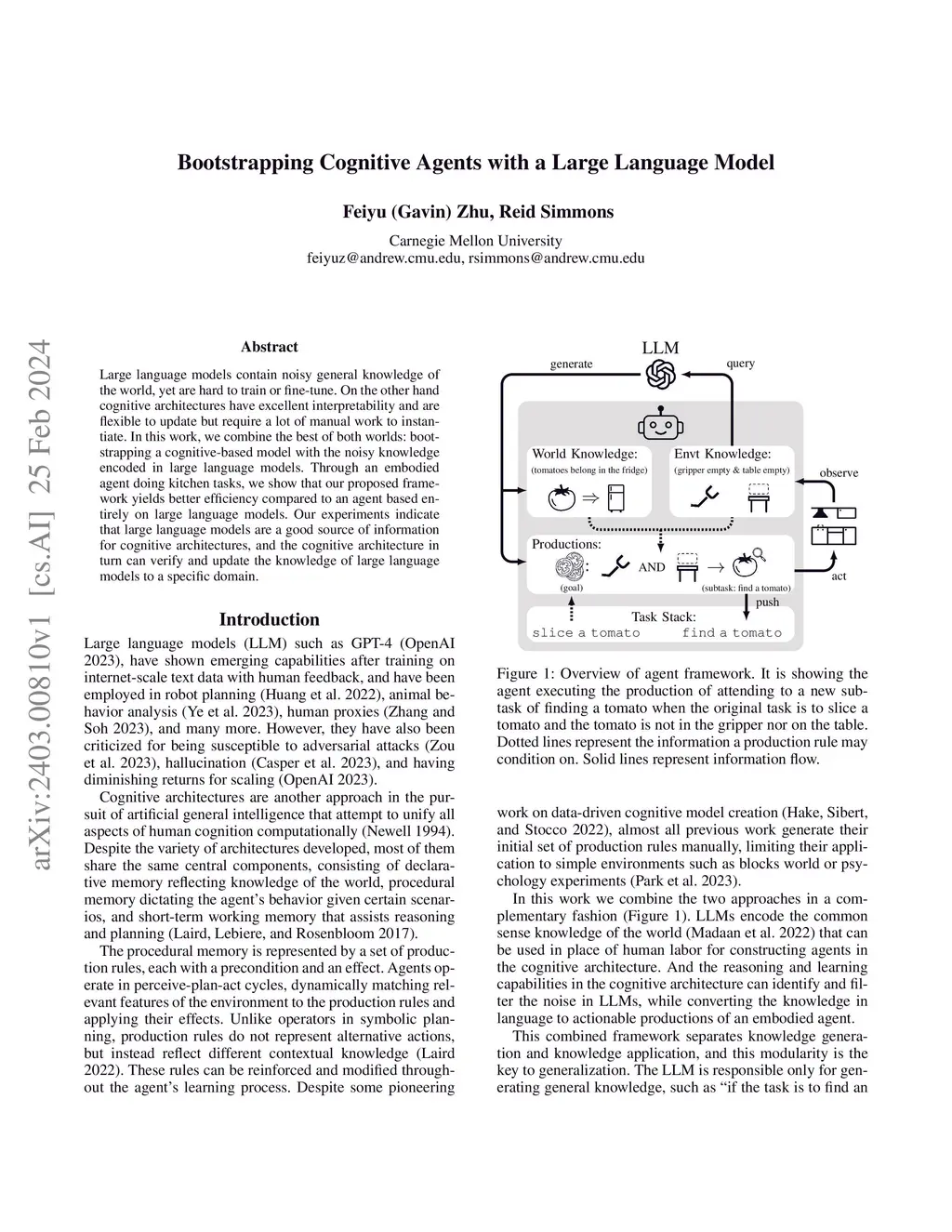 Large language models contain noisy general knowledge of the world, yet are hard to train or fine-tune. On the other hand cognitive architectures have excellent interpretability and are flexible to update but require a lot of manual work to instantiate. In this work, we combine the best of both worlds: bootstrapping a cognitive-based model with the noisy knowledge encoded in large language models. Through an embodied agent doing kitchen tasks, we show that our proposed framework yields better efficiency compared to an agent based entirely on large language models. Our experiments indicate that large language models are a good source of information for cognitive architectures, and the cognitive architecture in turn can verify and update the knowledge of large language models to a specific domain.