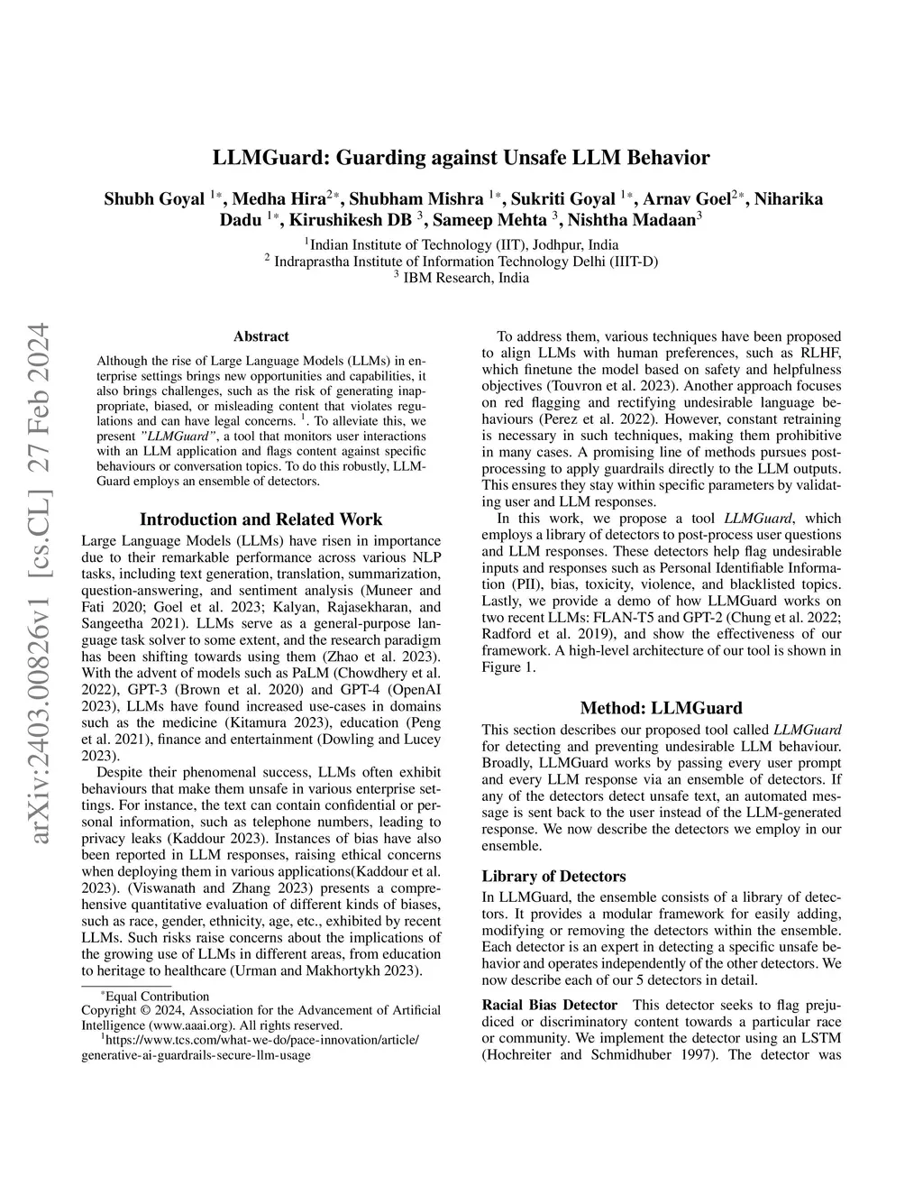 Although the rise of Large Language Models (LLMs) in enterprise settings brings new opportunities and capabilities, it also brings challenges, such as the risk of generating inappropriate, biased, or misleading content that violates regulations and can have legal concerns. To alleviate this, we present "LLMGuard", a tool that monitors user interactions with an LLM application and flags content against specific behaviours or conversation topics. To do this robustly, LLMGuard employs an ensemble of detectors.