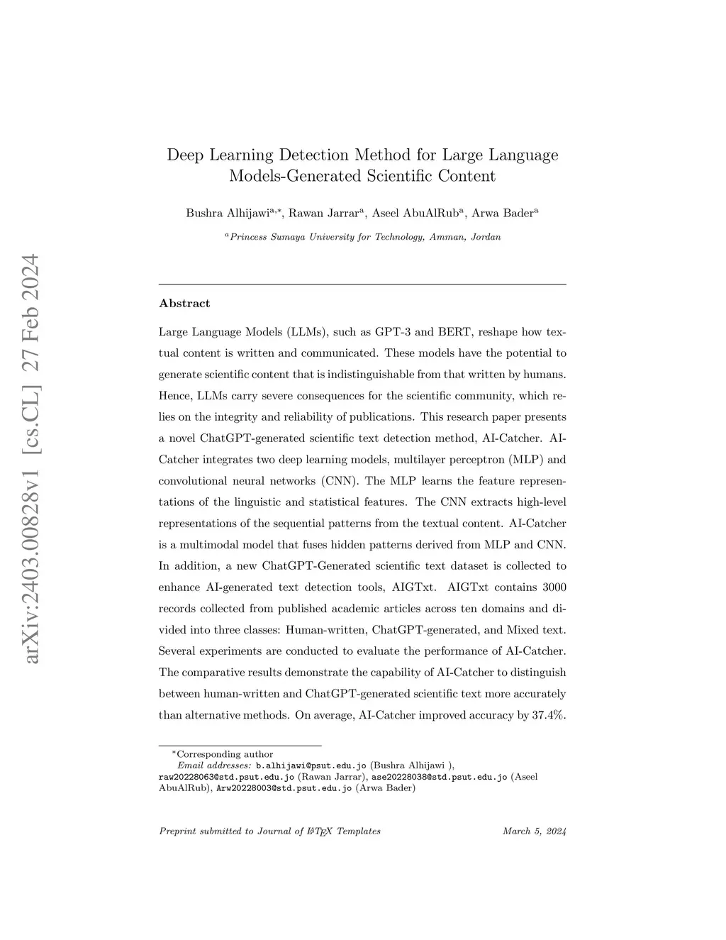 Large Language Models (LLMs), such as GPT-3 and BERT, reshape how textual content is written and communicated. These models have the potential to generate scientific content that is indistinguishable from that written by humans. Hence, LLMs carry severe consequences for the scientific community, which relies on the integrity and reliability of publications. This research paper presents a novel ChatGPT-generated scientific text detection method, AI-Catcher. AI-Catcher integrates two deep learning models, multilayer perceptron (MLP) and convolutional neural networks (CNN). The MLP learns the feature representations of the linguistic and statistical features. The CNN extracts high-level representations of the sequential patterns from the textual content. AI-Catcher is a multimodal model that fuses hidden patterns derived from MLP and CNN. In addition, a new ChatGPT-Generated scientific text dataset is collected to enhance AI-generated text detection tools, AIGTxt. AIGTxt contains 3000 records collected from published academic articles across ten domains and divided into three classes: Human-written, ChatGPT-generated, and Mixed text. Several experiments are conducted to evaluate the performance of AI-Catcher. The comparative results demonstrate the capability of AI-Catcher to distinguish between human-written and ChatGPT-generated scientific text more accurately than alternative methods. On average, AI-Catcher improved accuracy by 37.4%.