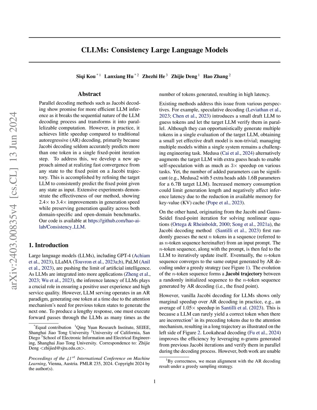 Parallel decoding methods such as Jacobi decoding show promise for more efficient LLM inference as it breaks the sequential nature of the LLM decoding process and transforms it into parallelizable computation. However, in practice, it achieves little speedup compared to traditional autoregressive (AR) decoding, primarily because Jacobi decoding seldom accurately predicts more than one token in a single fixed-point iteration step. To address this, we develop a new approach aimed at realizing fast convergence from any state to the fixed point on a Jacobi trajectory. This is accomplished by refining the target LLM to consistently predict the fixed point given any state as input. Extensive experiments demonstrate the effectiveness of our method, showing 2.4 to 3.4 improvements in generation speed while preserving generation quality across both domain-specific and open-domain benchmarks.