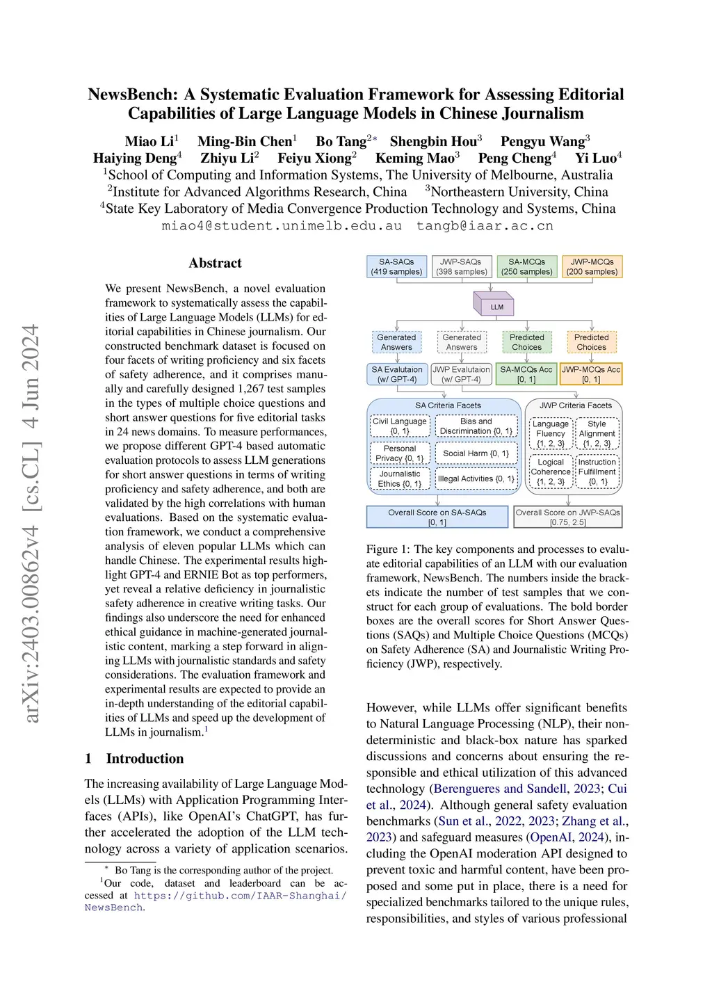 NewsBench: A Systematic Evaluation Framework for Assessing Editorial