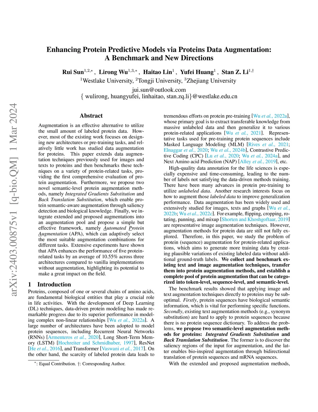 Augmentation is an effective alternative to utilize the small amount of labeled protein data. However, most of the existing work focuses on design-ing new architectures or pre-training tasks, and relatively little work has studied data augmentation for proteins. This paper extends data augmentation techniques previously used for images and texts to proteins and then benchmarks these techniques on a variety of protein-related tasks, providing the first comprehensive evaluation of protein augmentation. Furthermore, we propose two novel semantic-level protein augmentation methods, namely Integrated Gradients Substitution and Back Translation Substitution, which enable protein semantic-aware augmentation through saliency detection and biological knowledge. Finally, we integrate extended and proposed augmentations into an augmentation pool and propose a simple but effective framework, namely Automated Protein Augmentation (APA), which can adaptively select the most suitable augmentation combinations for different tasks. Extensive experiments have shown that APA enhances the performance of five protein related tasks by an average of 10.55% across three architectures compared to vanilla implementations without augmentation, highlighting its potential to make a great impact on the field.