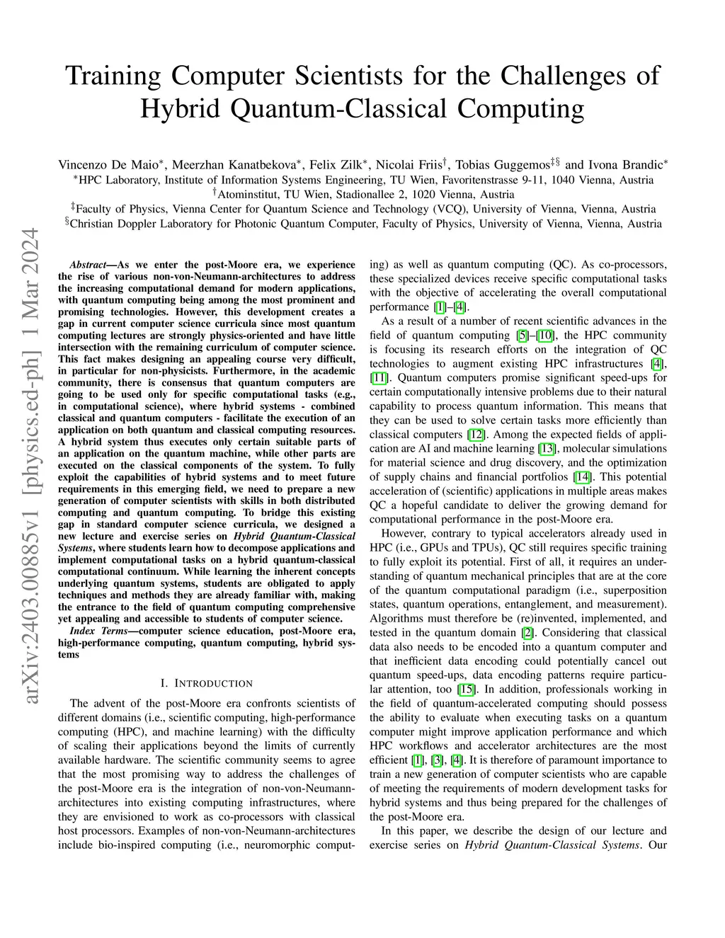 As we enter the post-Moore era, we experience the rise of various non-von-Neumann-architectures to address the increasing computational demand for modern applications, with quantum computing being among the most prominent and promising technologies. However, this development creates a gap in current computer science curricula since most quantum computing lectures are strongly physics-oriented and have little intersection with the remaining curriculum of computer science. This fact makes designing an appealing course very difficult, in particular for non-physicists. Furthermore, in the academic community, there is consensus that quantum computers are going to be used only for specific computational tasks (e.g., in computational science), where hybrid systems - combined classical and quantum computers - facilitate the execution of an application on both quantum and classical computing resources. A hybrid system thus executes only certain suitable parts of an application on the quantum machine, while other parts are executed on the classical components of the system. To fully exploit the capabilities of hybrid systems and to meet future requirements in this emerging field, we need to prepare a new generation of computer scientists with skills in both distributed computing and quantum computing. To bridge this existing gap in standard computer science curricula, we designed a new lecture and exercise series on Hybrid Quantum-Classical Systems, where students learn how to decompose applications and implement computational tasks on a hybrid quantum-classical computational continuum. While learning the inherent concepts underlying quantum systems, students are obligated to apply techniques and methods they are already familiar with, making the entrance to the field of quantum computing comprehensive yet appealing and accessible to students of computer science.