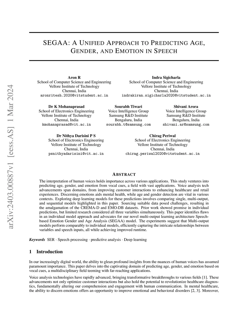 The interpretation of human voices holds importance across various applications. This study ventures into predicting age, gender, and emotion from vocal cues, a field with vast applications. Voice analysis tech advancements span domains, from improving customer interactions to enhancing healthcare and retail experiences. Discerning emotions aids mental health, while age and gender detection are vital in various contexts. Exploring deep learning models for these predictions involves comparing single, multi-output, and sequential models highlighted in this paper. Sourcing suitable data posed challenges, resulting in the amalgamation of the CREMA-D and EMO-DB datasets. Prior work showed promise in individual predictions, but limited research considered all three variables simultaneously. This paper identifies flaws in an individual model approach and advocates for our novel multi-output learning architecture Speech-based Emotion Gender and Age Analysis (SEGAA) model. The experiments suggest that Multi-output models perform comparably to individual models, efficiently capturing the intricate relationships between variables and speech inputs, all while achieving improved runtime.