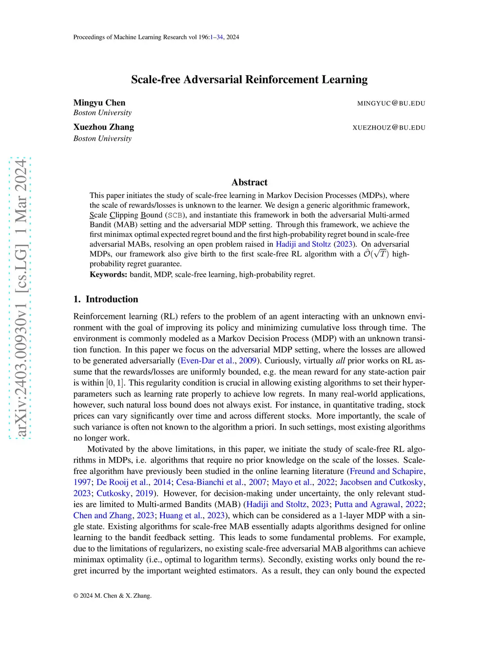 This paper initiates the study of scale-free learning in Markov Decision Processes (MDPs), where the scale of rewards/losses is unknown to the learner. We design a generic algorithmic framework, \underline{S}cale \underline{C}lipping \underline{B}ound (\texttt{SCB}), and instantiate this framework in both the adversarial Multi-armed Bandit (MAB) setting and the adversarial MDP setting. Through this framework, we achieve the first minimax optimal expected regret bound and the first high-probability regret bound in scale-free adversarial MABs, resolving an open problem raised in \cite{hadiji2023adaptation}. On adversarial MDPs, our framework also give birth to the first scale-free RL algorithm with a high-probability regret guarantee.