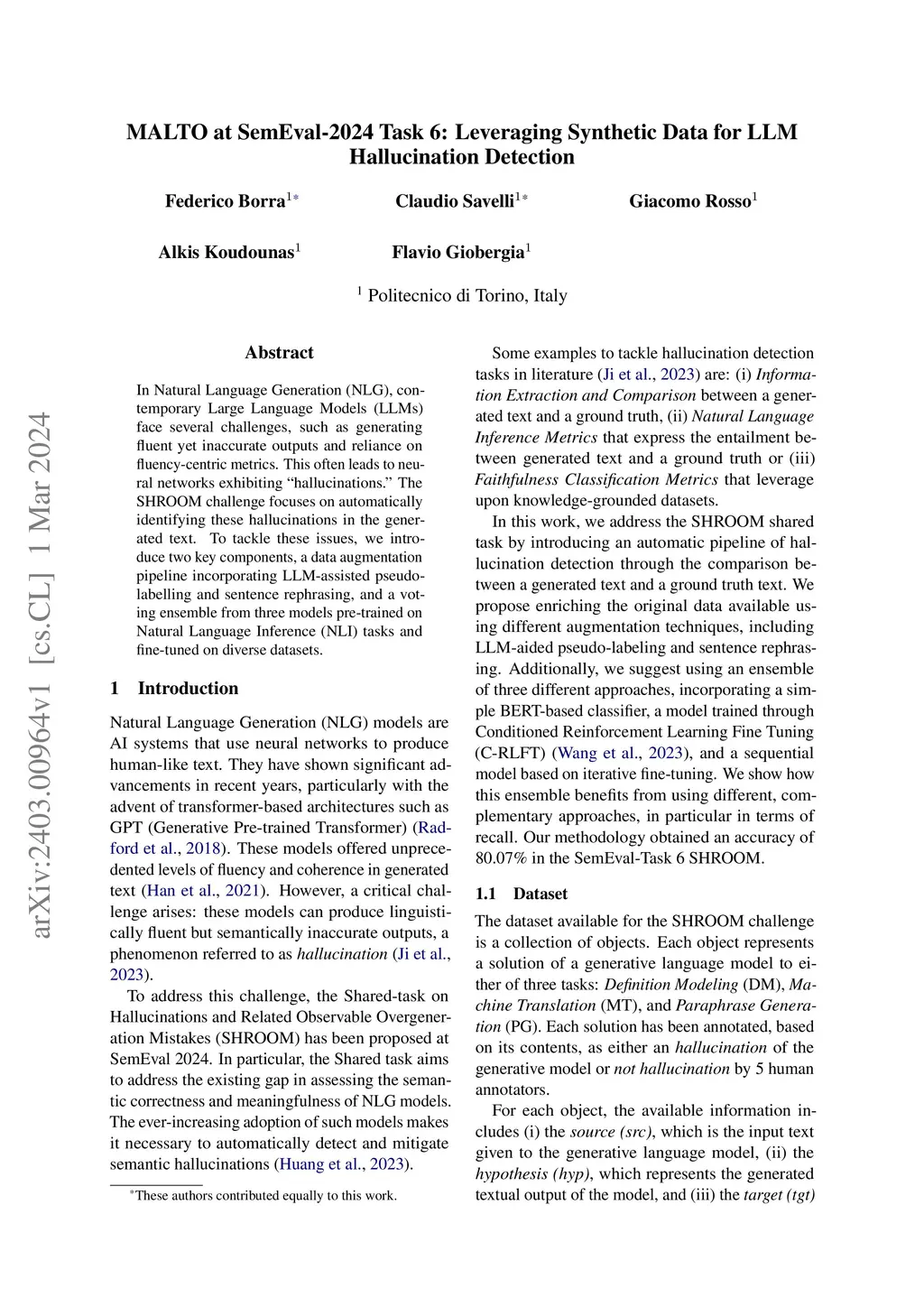 MALTO at SemEval-2024 Task 6: Leveraging Synthetic Data for LLM
