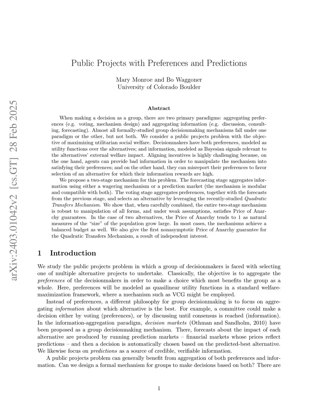 When making a decision as a group, there are two primary paradigms: aggregating preferences (e.g. voting, mechanism design) and aggregating information (e.g. discussion, consulting, forecasting). Almost all formally-studied group decisionmaking mechanisms fall under one paradigm or the other, but not both. We consider a public projects problem with the objective of maximizing utilitarian social welfare. Decisionmakers have both preferences, modeled as utility functions over the alternatives; and information, modeled as Bayesian signals relevant to the alternatives' external welfare impact. Aligning incentives is highly challenging because, on the one hand, agents can provide bad information in order to manipulate the mechanism into satisfying their preferences; and on the other hand, they can misreport their preferences to favor selection of an alternative for which their information rewards are high.We propose a two-stage mechanism for this problem. The forecasting stage aggregates information using either a wagering mechanism or a prediction market (the mechanism is modular and compatible with both). The voting stage aggregates preferences, together with the forecasts from the previous stage, and selects an alternative by leveraging the recently-studied Quadratic Transfers Mechanism. We show that, when carefully combined, the entire two-stage mechanism is robust to manipulation of all forms, and under weak assumptions, satisfies Price of Anarchy guarantees. In the case of two alternatives, the Price of Anarchy tends to 1 as natural measures of the "size" of the population grow large. In most cases, the mechanisms achieve a balanced budget as well. We also give the first nonasymptotic Price of Anarchy guarantee for the Quadratic Transfers Mechanism, a result of independent interest.