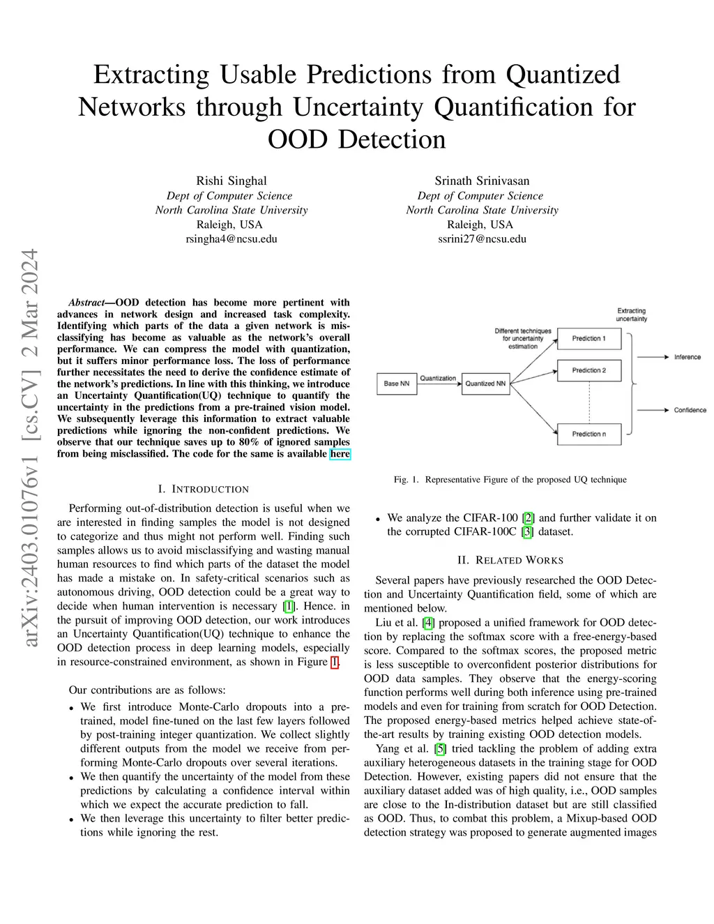 OOD detection has become more pertinent with advances in network design and increased task complexity. Identifying which parts of the data a given network is misclassifying has become as valuable as the network's overall performance. We can compress the model with quantization, but it suffers minor performance loss. The loss of performance further necessitates the need to derive the confidence estimate of the network's predictions. In line with this thinking, we introduce an Uncertainty Quantification(UQ) technique to quantify the uncertainty in the predictions from a pre-trained vision model. We subsequently leverage this information to extract valuable predictions while ignoring the non-confident predictions. We observe that our technique saves up to 80% of ignored samples from being misclassified. The code for the same is available here.