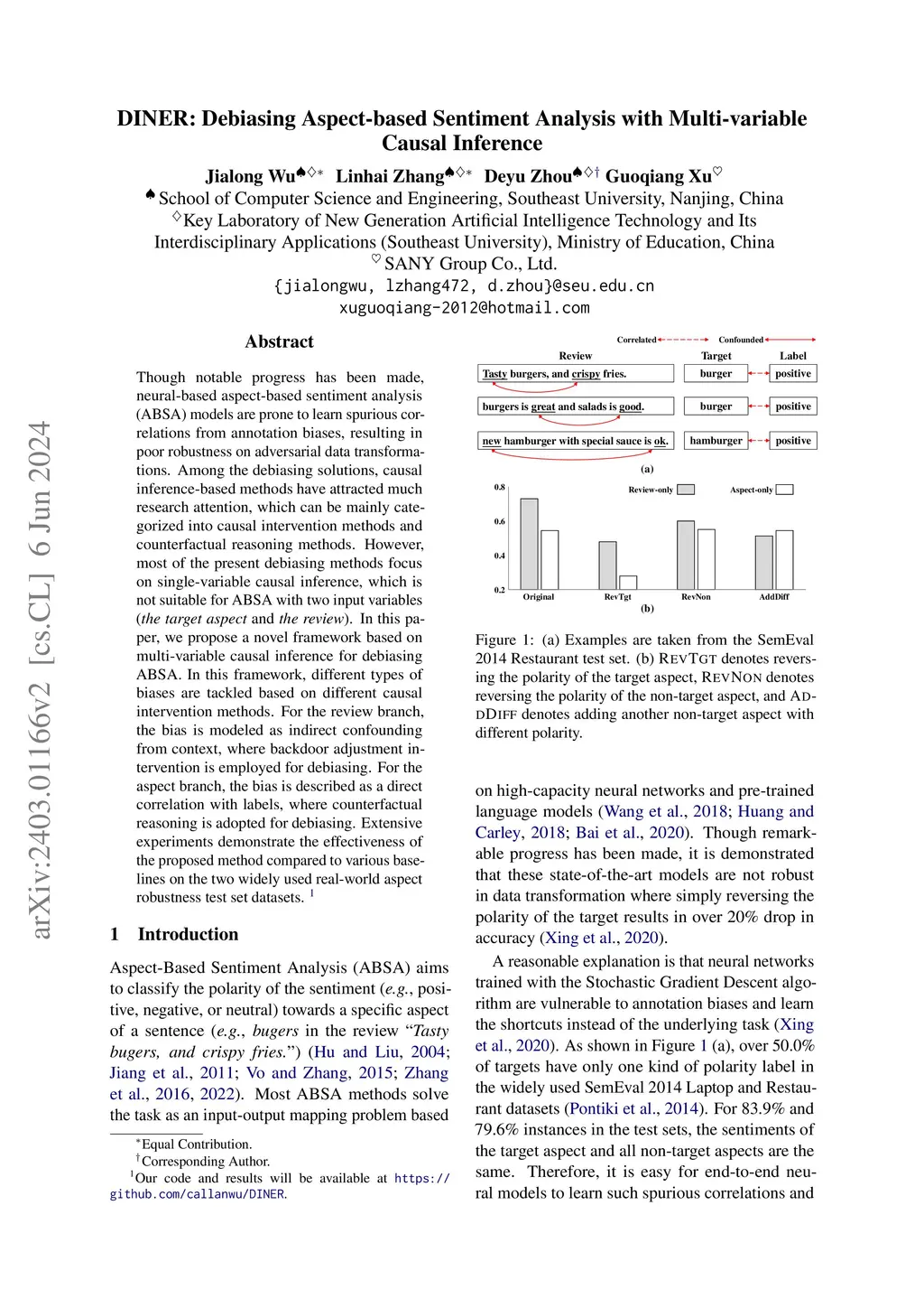 DINER: Debiasing Aspect-based Sentiment Analysis with Multi-variable