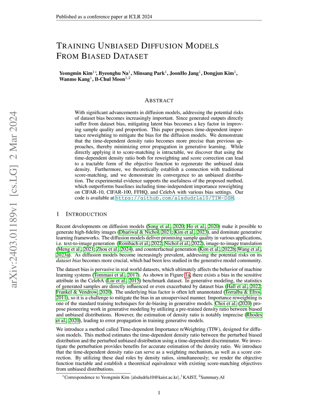 With significant advancements in diffusion models, addressing the potential risks of dataset bias becomes increasingly important. Since generated outputs directly suffer from dataset bias, mitigating latent bias becomes a key factor in improving sample quality and proportion. This paper proposes time-dependent importance reweighting to mitigate the bias for the diffusion models. We demonstrate that the time-dependent density ratio becomes more precise than previous approaches, thereby minimizing error propagation in generative learning. While directly applying it to score-matching is intractable, we discover that using the time-dependent density ratio both for reweighting and score correction can lead to a tractable form of the objective function to regenerate the unbiased data density. Furthermore, we theoretically establish a connection with traditional score-matching, and we demonstrate its convergence to an unbiased distribution. The experimental evidence supports the usefulness of the proposed method, which outperforms baselines including time-independent importance reweighting on CIFAR-10, CIFAR-100, FFHQ, and CelebA with various bias settings. Our code is available at https://github.com/alsdudrla10/TIW-DSM.