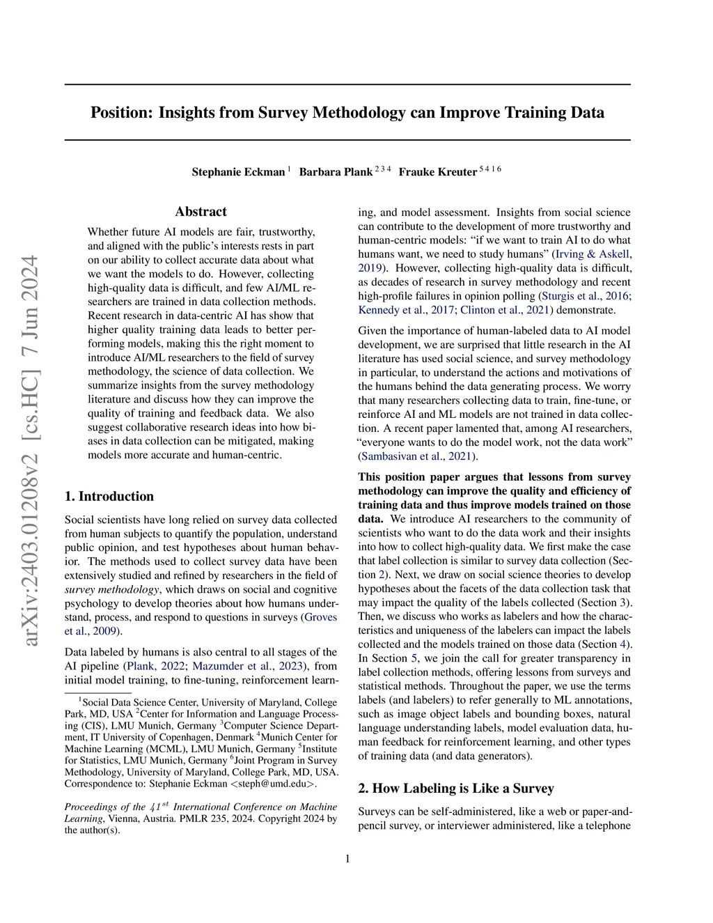 Whether future AI models are fair, trustworthy, and aligned with the public's interests rests in part on our ability to collect accurate data about what we want the models to do. However, collecting high-quality data is difficult, and few AI/ML researchers are trained in data collection methods. Recent research in data-centric AI has show that higher quality training data leads to better performing models, making this the right moment to introduce AI/ML researchers to the field of survey methodology, the science of data collection. We summarize insights from the survey methodology literature and discuss how they can improve the quality of training and feedback data. We also suggest collaborative research ideas into how biases in data collection can be mitigated, making models more accurate and human-centric.