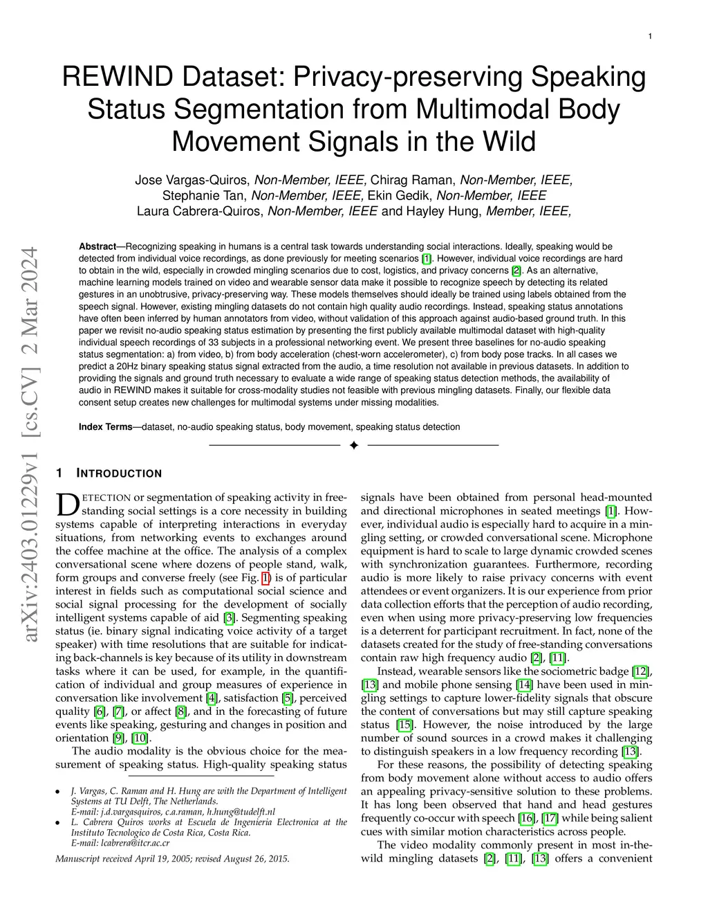 REWIND Dataset: Privacy-preserving Speaking Status Segmentation from