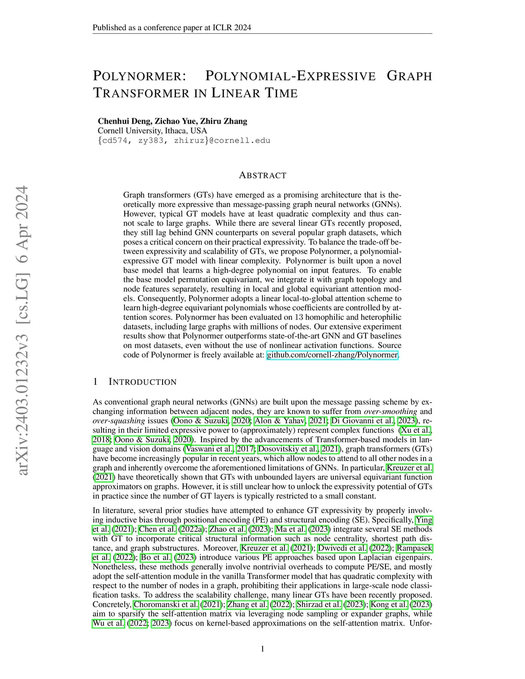 Graph transformers (GTs) have emerged as a promising architecture that is theoretically more expressive than message-passing graph neural networks (GNNs). However, typical GT models have at least quadratic complexity and thus cannot scale to large graphs. While there are several linear GTs recently proposed, they still lag behind GNN counterparts on several popular graph datasets, which poses a critical concern on their practical expressivity. To balance the trade-off between expressivity and scalability of GTs, we propose Polynormer, a polynomial-expressive GT model with linear complexity. Polynormer is built upon a novel base model that learns a high-degree polynomial on input features. To enable the base model permutation equivariant, we integrate it with graph topology and node features separately, resulting in local and global equivariant attention models. Consequently, Polynormer adopts a linear local-to-global attention scheme to learn high-degree equivariant polynomials whose coefficients are controlled by attention scores. Polynormer has been evaluated on homophilic and heterophilic datasets, including large graphs with millions of nodes. Our extensive experiment results show that Polynormer outperforms state-of-the-art GNN and GT baselines on most datasets, even without the use of nonlinear activation functions.
