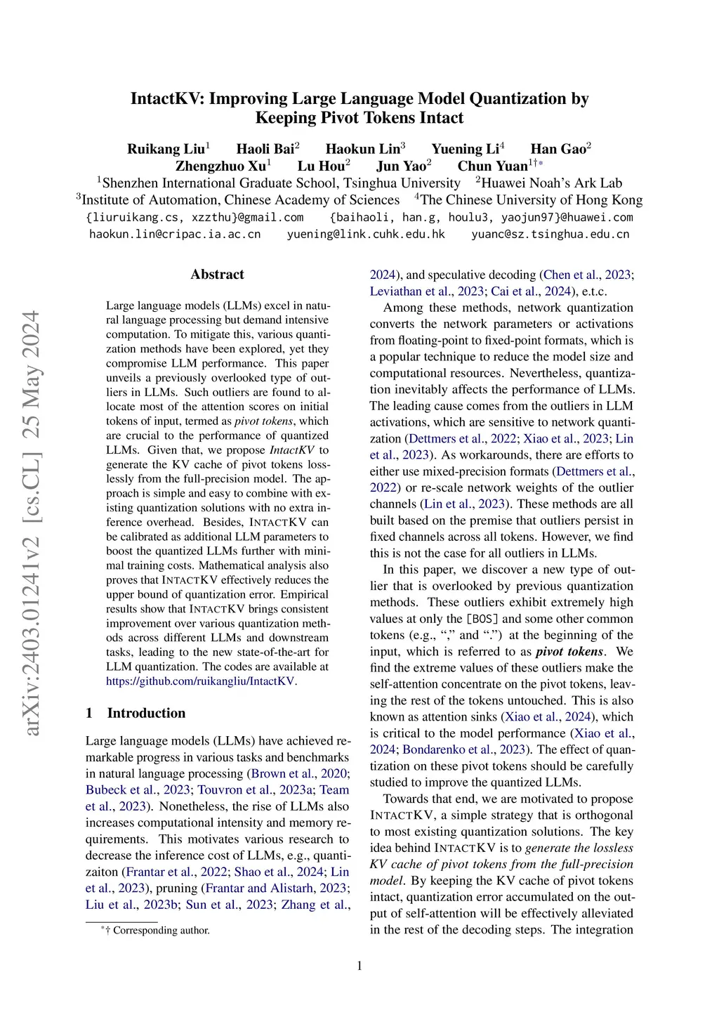 Large language models (LLMs) excel in natural language processing but demand intensive computation. To mitigate this, various quantization methods have been explored, yet they compromise LLM performance. This paper unveils a previously overlooked type of outliers in LLMs. Such outliers are found to allocate most of the attention scores on initial tokens of input, termed as pivot tokens, which are crucial to the performance of quantized LLMs. Given that, we propose IntactKV to generate the KV cache of pivot tokens losslessly from the full-precision model. The approach is simple and easy to combine with existing quantization solutions with no extra inference overhead. Besides, IntactKV can be calibrated as additional LLM parameters to boost the quantized LLMs further with minimal training costs. Mathematical analysis also proves that IntactKV effectively reduces the upper bound of quantization error. Empirical results show that IntactKV brings consistent improvement over various quantization methods across different LLMs and downstream tasks, leading to the new state-of-the-art for LLM quantization. The codes are available at https://github.com/ruikangliu/IntactKV.