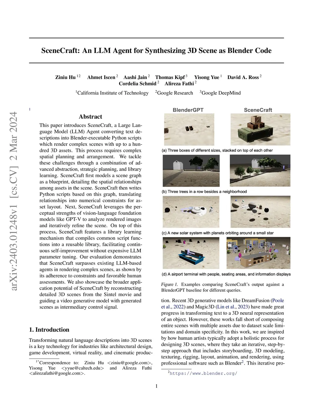 This paper introduces SceneCraft, a Large Language Model (LLM) Agent converting text descriptions into Blender-executable Python scripts which render complex scenes with up to a hundred 3D assets. This process requires complex spatial planning and arrangement. We tackle these challenges through a combination of advanced abstraction, strategic planning, and library learning. SceneCraft first models a scene graph as a blueprint, detailing the spatial relationships among assets in the scene. SceneCraft then writes Python scripts based on this graph, translating relationships into numerical constraints for asset layout. Next, SceneCraft leverages the perceptual strengths of vision-language foundation models like GPT-V to analyze rendered images and iteratively refine the scene. On top of this process, SceneCraft features a library learning mechanism that compiles common script functions into a reusable library, facilitating continuous self-improvement without expensive LLM parameter tuning. Our evaluation demonstrates that SceneCraft surpasses existing LLM-based agents in rendering complex scenes, as shown by its adherence to constraints and favorable human assessments. We also showcase the broader application potential of SceneCraft by reconstructing detailed 3D scenes from the Sintel movie and guiding a video generative model with generated scenes as intermediary control signal.