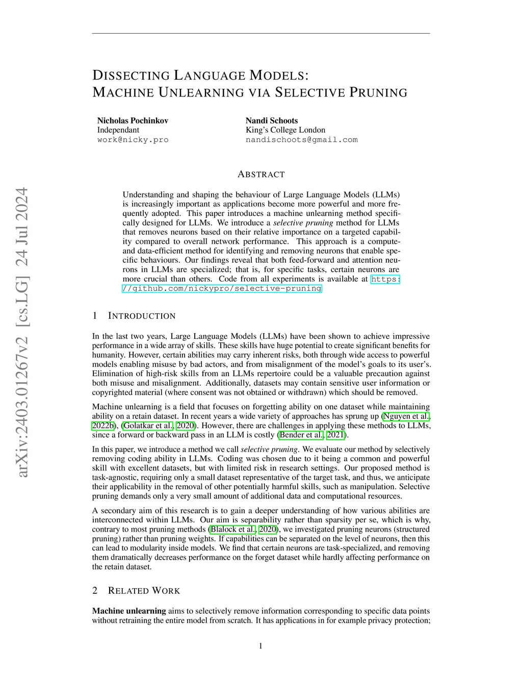 Understanding and shaping the behaviour of Large Language Models (LLMs) is increasingly important as applications become more powerful and more frequently adopted. This paper introduces a machine unlearning method specifically designed for LLMs. We introduce a selective pruning method for LLMs that removes neurons based on their relative importance on a targeted capability compared to overall network performance. This approach is a compute- and data-efficient method for identifying and removing neurons that enable specific behaviours. Our findings reveal that both feed-forward and attention neurons in LLMs are specialized; that is, for specific tasks, certain neurons are more crucial than others.