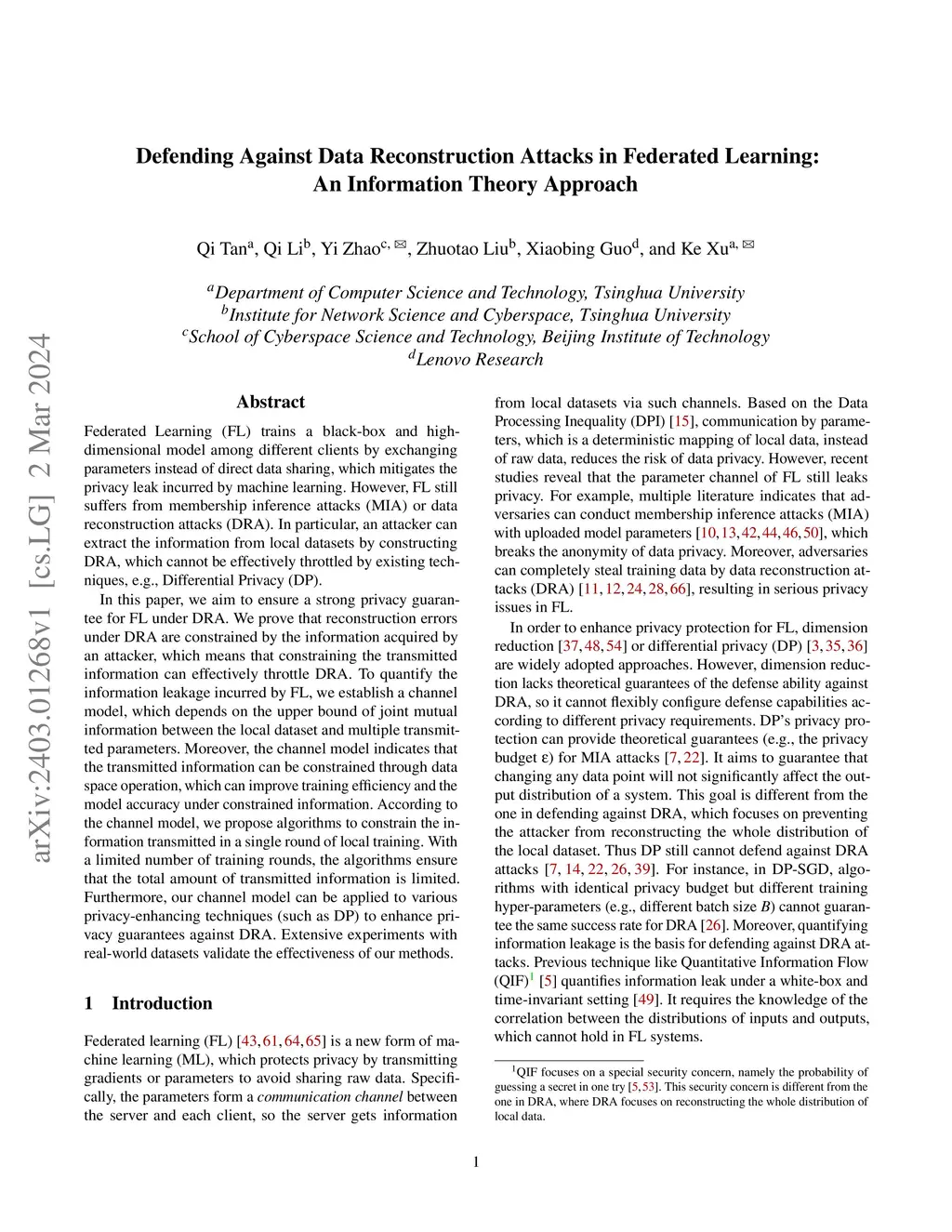 Federated Learning (FL) trains a black-box and high-dimensional model among different clients by exchanging parameters instead of direct data sharing, which mitigates the privacy leak incurred by machine learning. However, FL still suffers from membership inference attacks (MIA) or data reconstruction attacks (DRA). In particular, an attacker can extract the information from local datasets by constructing DRA, which cannot be effectively throttled by existing techniques, e.g., Differential Privacy (DP). In this paper, we aim to ensure a strong privacy guarantee for FL under DRA. We prove that reconstruction errors under DRA are constrained by the information acquired by an attacker, which means that constraining the transmitted information can effectively throttle DRA. To quantify the information leakage incurred by FL, we establish a channel model, which depends on the upper bound of joint mutual information between the local dataset and multiple transmitted parameters. Moreover, the channel model indicates that the transmitted information can be constrained through data space operation, which can improve training efficiency and the model accuracy under constrained information. According to the channel model, we propose algorithms to constrain the information transmitted in a single round of local training. With a limited number of training rounds, the algorithms ensure that the total amount of transmitted information is limited. Furthermore, our channel model can be applied to various privacy-enhancing techniques (such as DP) to enhance privacy guarantees against DRA. Extensive experiments with real-world datasets validate the effectiveness of our methods.