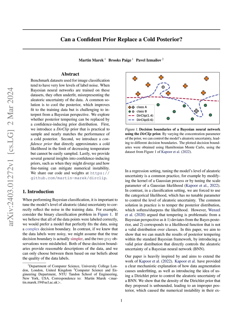 Benchmark datasets used for image classification tend to have very low levels of label noise. When Bayesian neural networks are trained on these datasets, they often underfit, misrepresenting the aleatoric uncertainty of the data. A common solution is to cool the posterior, which improves fit to the training data but is challenging to interpret from a Bayesian perspective. We explore whether posterior tempering can be replaced by a confidence-inducing prior distribution. First, we introduce a "DirClip" prior that is practical to sample and nearly matches the performance of a cold posterior. Second, we introduce a "confidence prior" that directly approximates a cold likelihood in the limit of decreasing temperature but cannot be easily sampled. Lastly, we provide several general insights into confidence-inducing priors, such as when they might diverge and how fine-tuning can mitigate numerical instability.