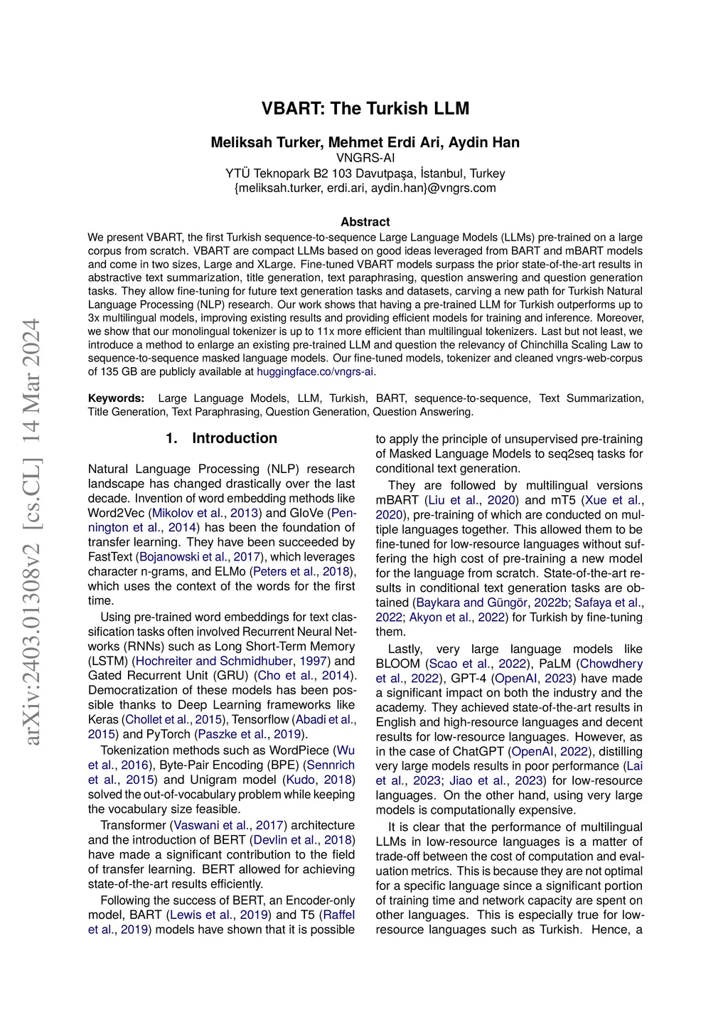 We present VBART, the first Turkish sequence-to-sequence Large Language Models (LLMs) pre-trained on a large corpus from scratch. VBART are compact LLMs based on good ideas leveraged from BART and mBART models and come in two sizes, Large and XLarge. Fine-tuned VBART models surpass the prior state-of-the-art results in abstractive text summarization, title generation, text paraphrasing, question answering and question generation tasks. They allow fine-tuning for future text generation tasks and datasets, carving a new path for Turkish Natural Language Processing (NLP) research. Our work shows that having a pre-trained LLM for Turkish outperforms up to 3x multilingual models, improving existing results and providing efficient models for training and inference. Moreover, we show that our monolingual tokenizer is up to 11x more efficient than multilingual tokenizers. Last but not least, we introduce a method to enlarge an existing pre-trained LLM and question the relevancy of Chinchilla Scaling Law to sequence-to-sequence masked language models. Our fine-tuned models, tokenizer and cleaned vngrs-web-corpus of 135 GB are publicly available at huggingface.co/vngrs-ai.