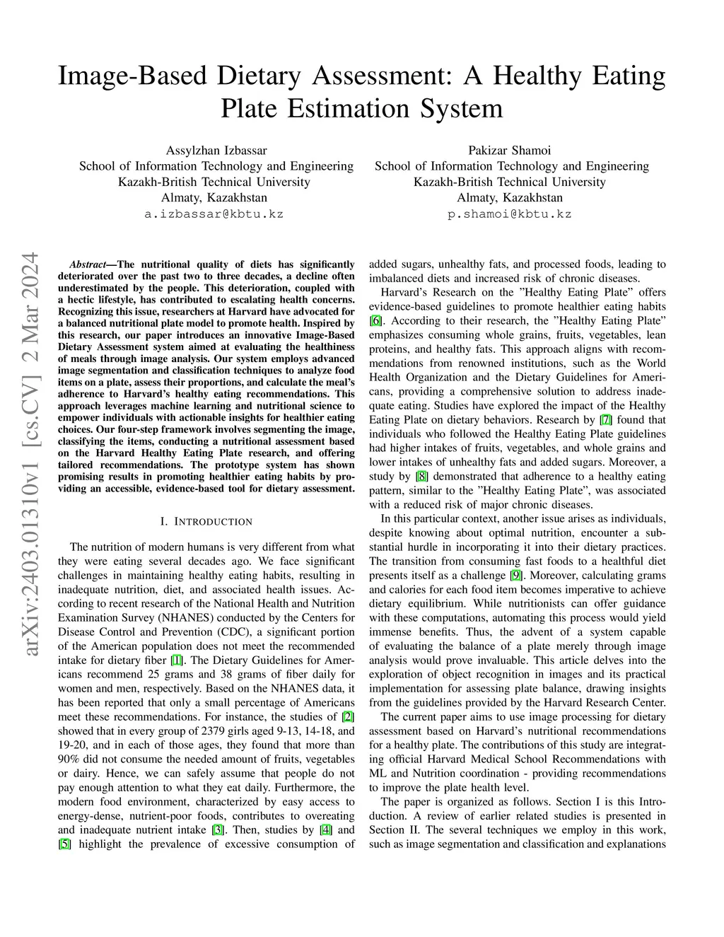 The nutritional quality of diets has significantly deteriorated over the past two to three decades, a decline often underestimated by the people. This deterioration, coupled with a hectic lifestyle, has contributed to escalating health concerns. Recognizing this issue, researchers at Harvard have advocated for a balanced nutritional plate model to promote health. Inspired by this research, our paper introduces an innovative Image-Based Dietary Assessment system aimed at evaluating the healthiness of meals through image analysis. Our system employs advanced image segmentation and classification techniques to analyze food items on a plate, assess their proportions, and calculate meal adherence to Harvard's healthy eating recommendations. This approach leverages machine learning and nutritional science to empower individuals with actionable insights for healthier eating choices. Our four-step framework involves segmenting the image, classifying the items, conducting a nutritional assessment based on the Harvard Healthy Eating Plate research, and offering tailored recommendations. The prototype system has shown promising results in promoting healthier eating habits by providing an accessible, evidence-based tool for dietary assessment.