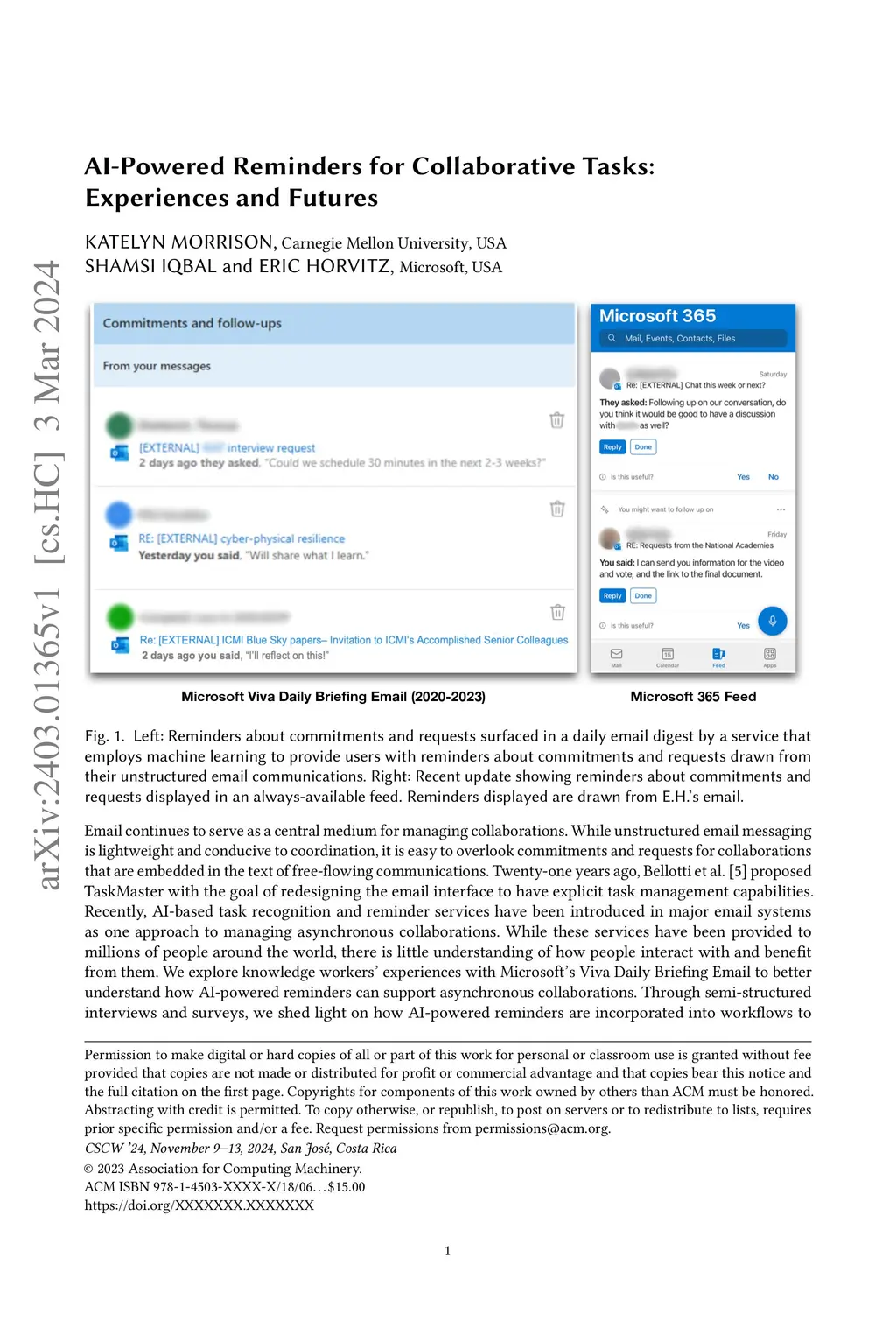 Email continues to serve as a central medium for managing collaborations. While unstructured email messaging is lightweight and conducive to coordination, it is easy to overlook commitments and requests for collaborations that are embedded in the text of free-flowing communications. Twenty-one years ago, Bellotti et al. proposed TaskMaster with the goal of redesigning the email interface to have explicit task management capabilities. Recently, AI-based task recognition and reminder services have been introduced in major email systems as one approach to managing asynchronous collaborations. While these services have been provided to millions of people around the world, there is little understanding of how people interact with and benefit from them. We explore knowledge workers' experiences with Microsoft's Viva Daily Briefing Email to better understand how AI-powered reminders can support asynchronous collaborations. Through semi-structured interviews and surveys, we shed light on how AI-powered reminders are incorporated into workflows to support asynchronous collaborations. We identify what knowledge workers prefer AI-powered reminders to remind them about and how they would like to interact with these reminders. Using mixed methods and a self-assessment methodology, we investigate the relationship between information workers' work styles and the perceived value of the Viva Daily Briefing Email to identify users who are more likely to benefit from AI-powered reminders for asynchronous collaborations. We conclude by discussing the experiences and futures of AI-powered reminders for collaborative tasks and asynchronous collaborations.