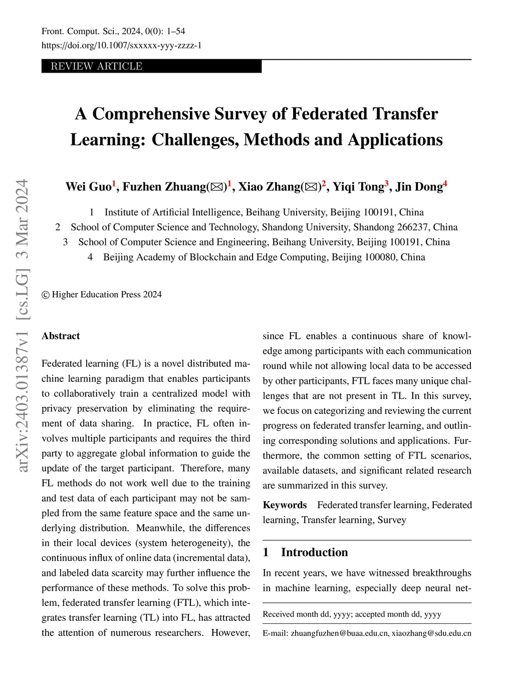 Federated learning (FL) is a novel distributed machine learning paradigm that enables participants to collaboratively train a centralized model with privacy preservation by eliminating the requirement of data sharing. In practice, FL often involves multiple participants and requires the third party to aggregate global information to guide the update of the target participant. Therefore, many FL methods do not work well due to the training and test data of each participant may not be sampled from the same feature space and the same underlying distribution. Meanwhile, the differences in their local devices (system heterogeneity), the continuous influx of online data (incremental data), and labeled data scarcity may further influence the performance of these methods. To solve this problem, federated transfer learning (FTL), which integrates transfer learning (TL) into FL, has attracted the attention of numerous researchers. However, since FL enables a continuous share of knowledge among participants with each communication round while not allowing local data to be accessed by other participants, FTL faces many unique challenges that are not present in TL. In this survey, we focus on categorizing and reviewing the current progress on federated transfer learning, and outlining corresponding solutions and applications. Furthermore, the common setting of FTL scenarios, available datasets, and significant related research are summarized in this survey.