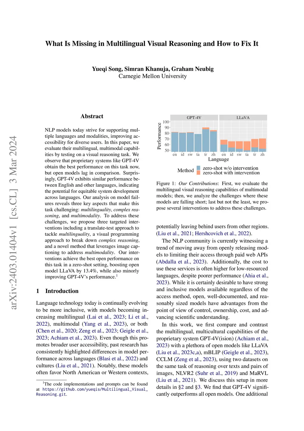 NLP models today strive for supporting multiple languages and modalities, improving accessibility for diverse users. In this paper, we evaluate their multilingual, multimodal capabilities by testing on a visual reasoning task. We observe that proprietary systems like GPT-4V obtain the best performance on this task now, but open models lag in comparison. Surprisingly, GPT-4V exhibits similar performance between English and other languages, indicating the potential for equitable system development across languages. Our analysis on model failures reveals three key aspects that make this task challenging: multilinguality, complex reasoning, and multimodality. To address these challenges, we propose three targeted interventions including a translate-test approach to tackle multilinguality, a visual programming approach to break down complex reasoning, and a method that leverages image captioning to address multimodality. Our interventions achieve the best open performance on this task in a zero-shot setting, boosting open models LLaVA-v1.5-13B by 13.4%, LLaVA-v1.6-34B by 20.3%, and Qwen-VL by 16.7%, while also minorly improving GPT-4V's performance.